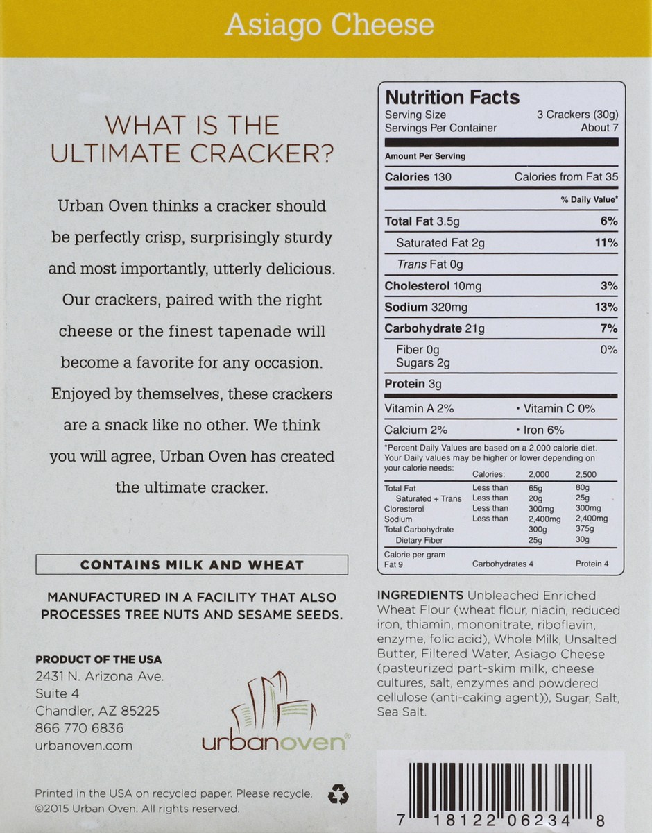 All natural. Perfectly crisp utterly delicious. Crackers: Asiago Cheese. Made from the finest Asiago cheese, these crackers have a subtle flavor that pairs perfectly with fruit, red wine or cheeses li…