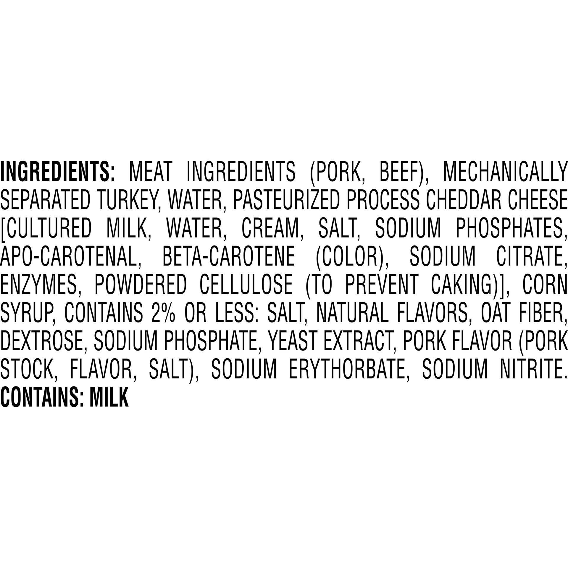 Meat Ingredients (Pork, Beef), Mechanically Separated Turkey, Water, Pasteurized Process Wisconsin Cheddar Cheese [cultured milk, water, cream, salt, sodium phosphates, apo-carotenal, beta-carotene (c…