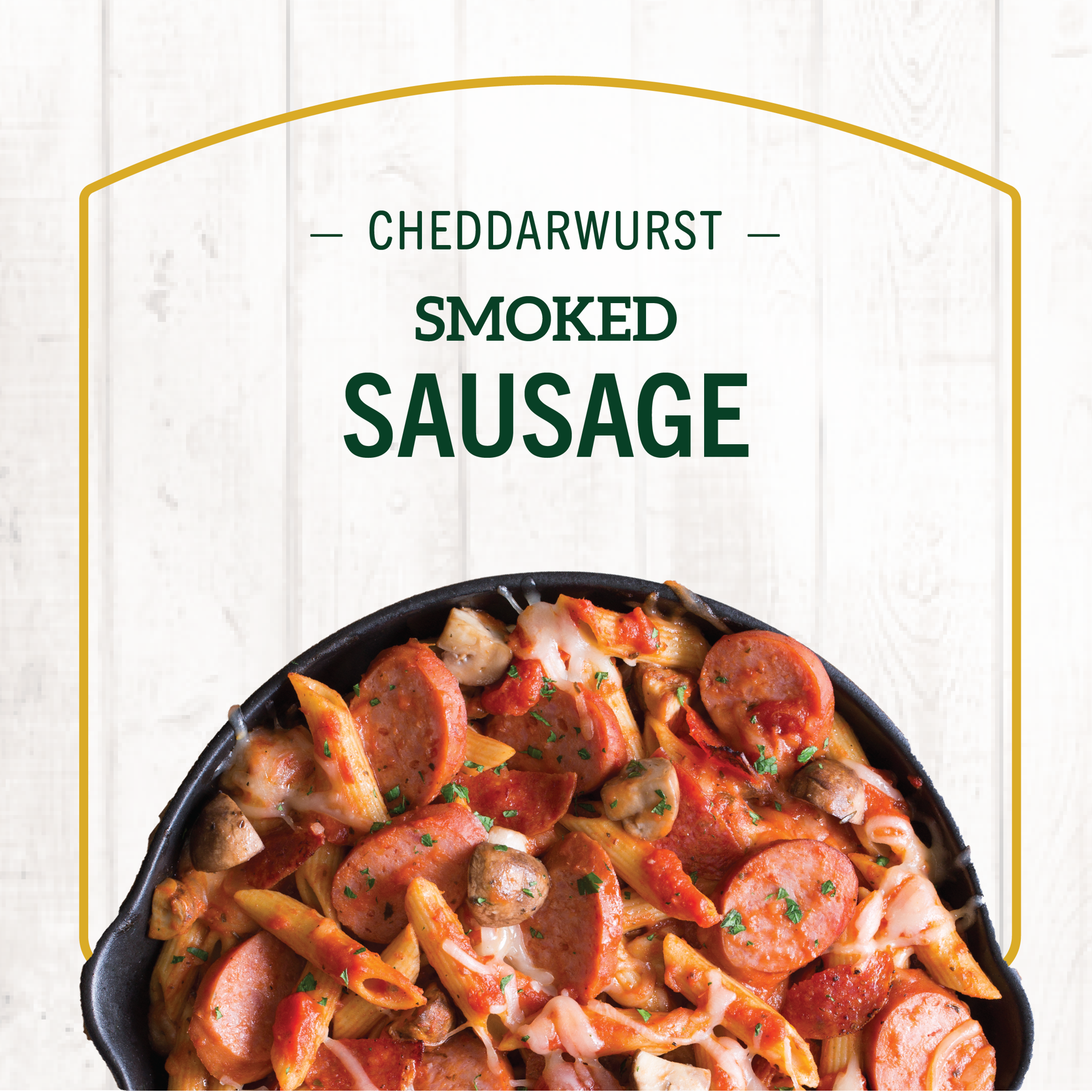 Hillshire Farm Cheddarwurst Smoked Sausage is a delicious answer to weeknight family dinners. Handcrafted with natural spices, real Wisconsin cheddar cheese and only our finest cuts of meat, this saus…