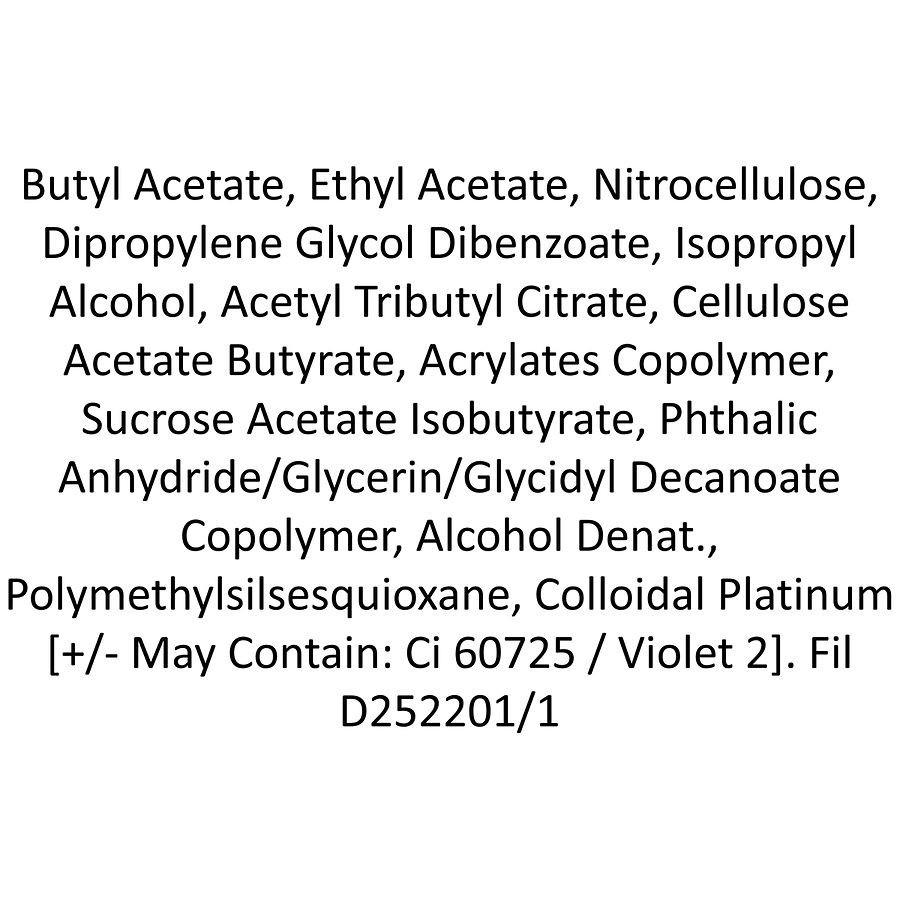 Butyl Acetate, Ethyl Acetate, Nitrocellulose, Dipropylene Glycol Dibenzoate, Isopropyl Alcohol, Acetyl Tributyl Citrate, Cellulose Acetate Butyrate, Acrylates Copolymer, Sucrose Acetate Isobutyrate, P…