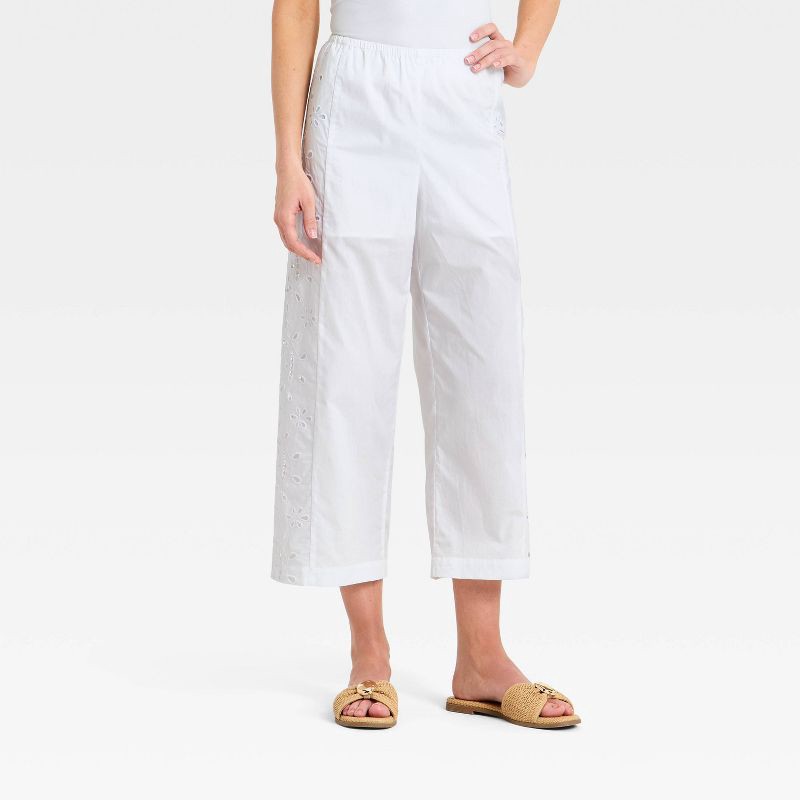Elevate your everyday wardrobe with these Cropped Straight Leg Eyelet Pull-On Pants from A New Day™. These high-rise cropped pants are made from 100% cotton fabric with lining tailored in a wide-leg f…
