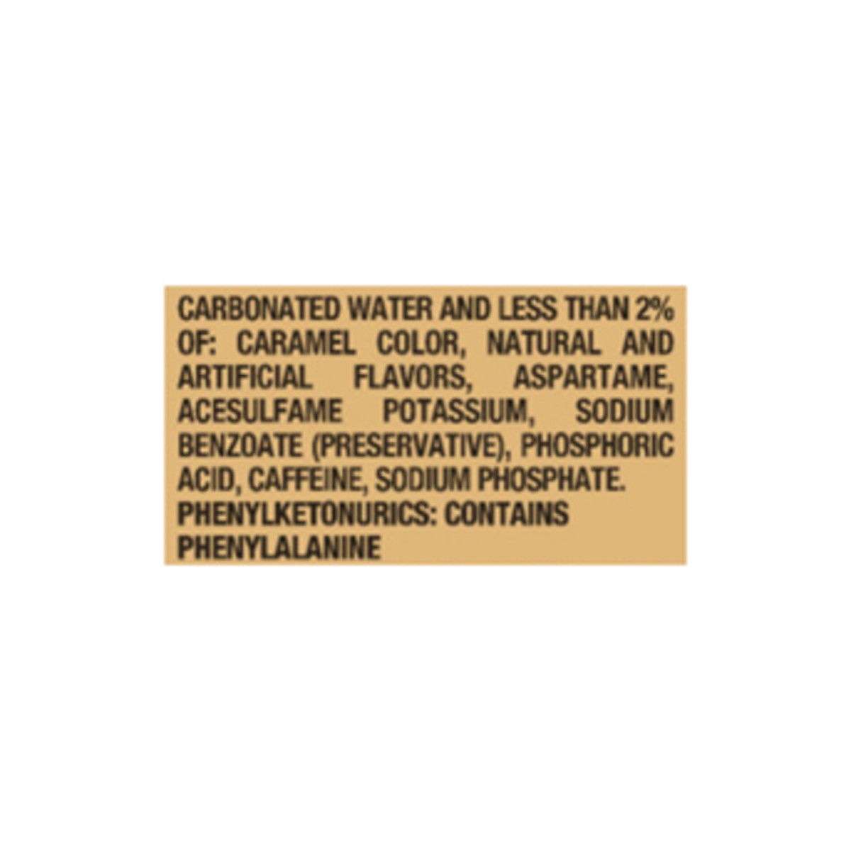 Carbonated Water and Less than 2% of: Caramel Color, Natural and Artificial Flavors, Aspartame, Acesulfame Potassium, Sodium Benzoate (Preservative), Phosphoric Acid, Caffeine, Sodium Phosphate.