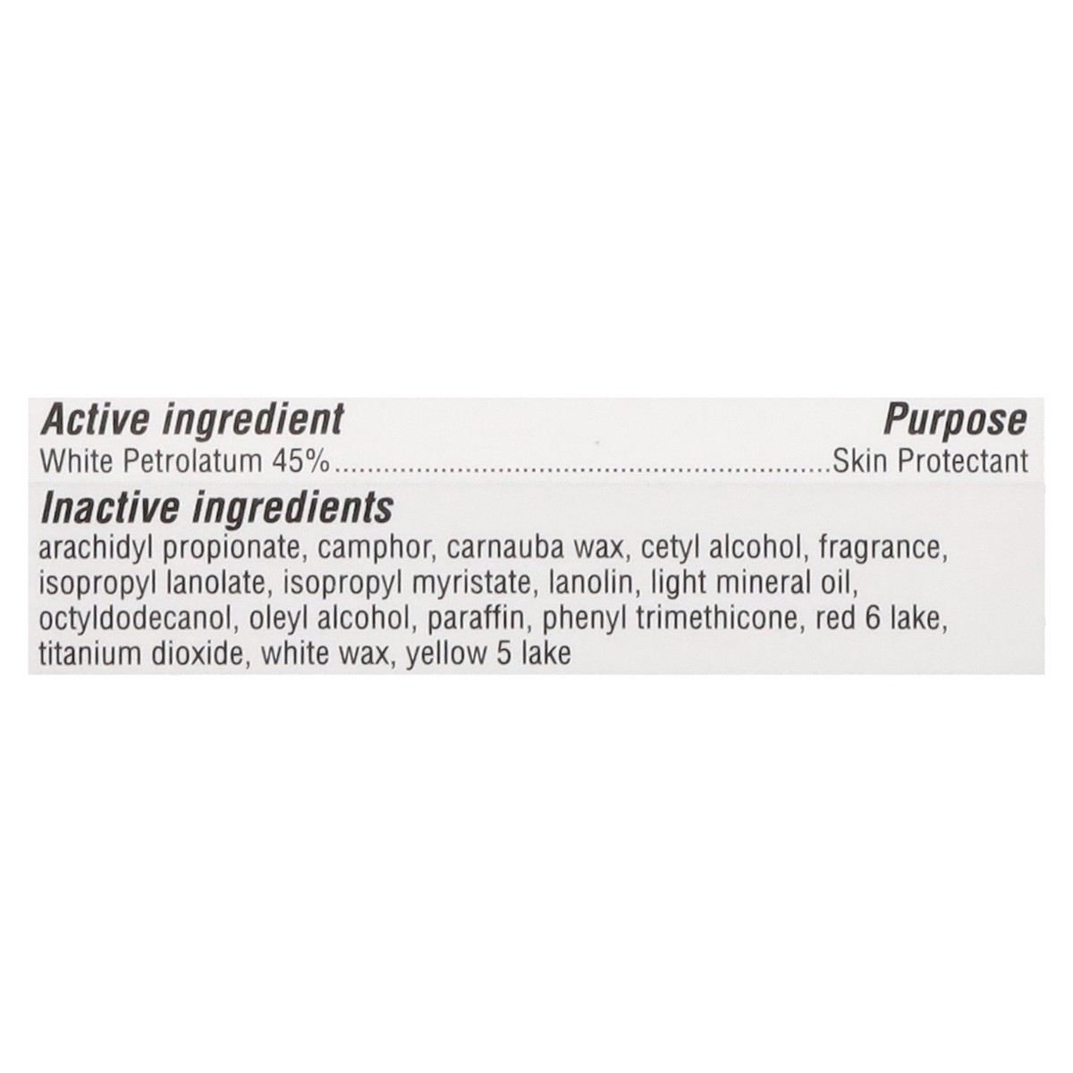 Active Ingredients: White Petrolatum (45 %), Skin Protectant. Inactive Ingredients: Arachidyl Propionate, Camphor, Carnauba Wax, Cetyl Alcohol, Fragrance, Isopropyl Lanolate, Isopropyl Myristate, Lano…