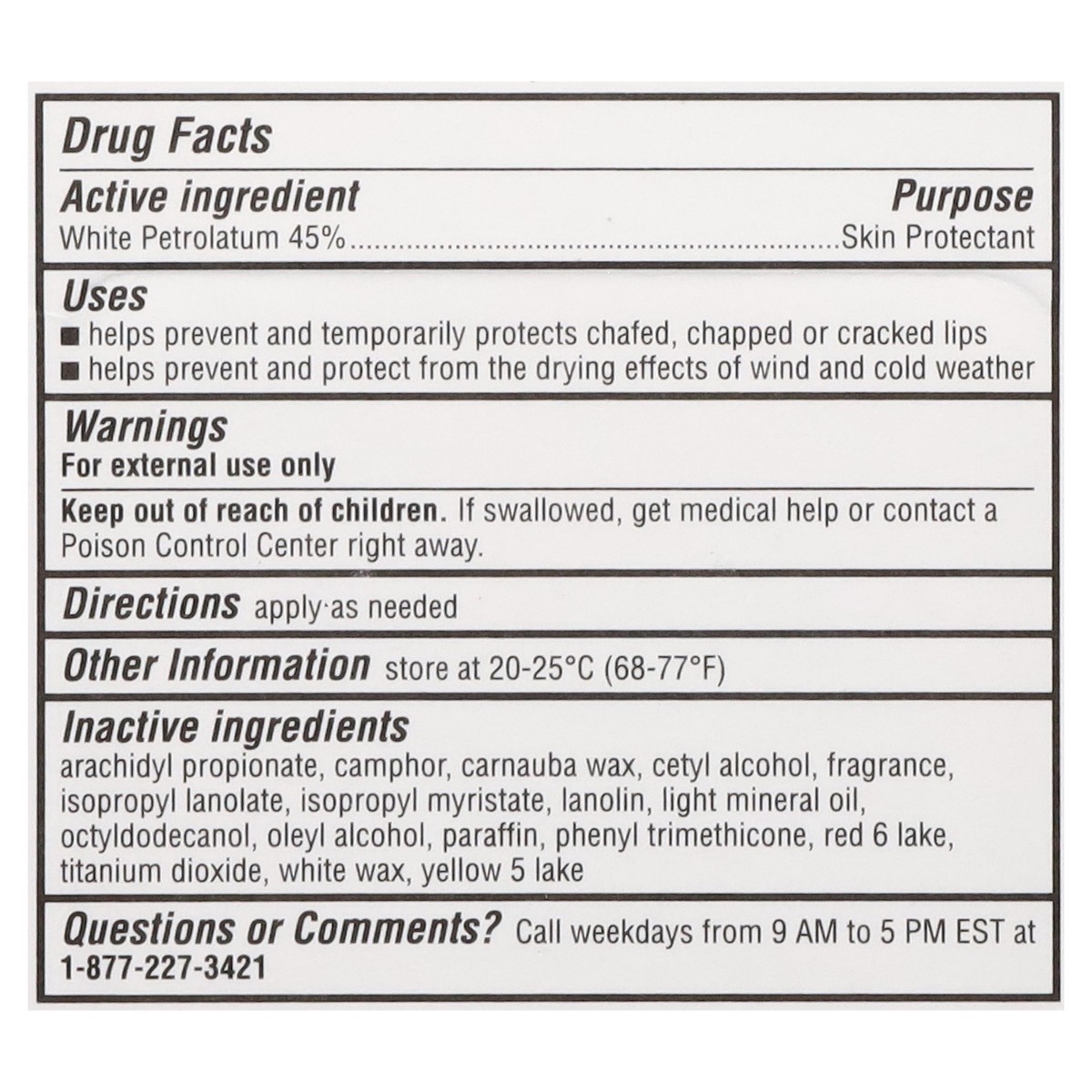 Active Ingredients: White Petrolatum (45 %), Skin Protectant. Inactive Ingredients: Arachidyl Propionate, Camphor, Carnauba Wax, Cetyl Alcohol, Fragrance, Isopropyl Lanolate, Isopropyl Myristate, Lano…
