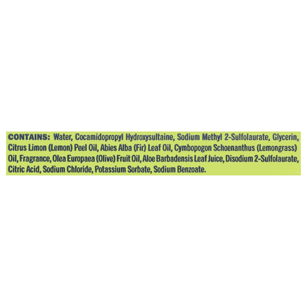 Contains: Water, Cocamidopropyl Hydroxysultaine, Sodium Methyl 2-Sulfolaurate, Glycerin, Citrus Limon (Lemon) Peel Oil, Abies Alba (Fir) Leaf Oil, Cymbopogon Schoenanthus (Lemongrass) Oil, Fragrance, …