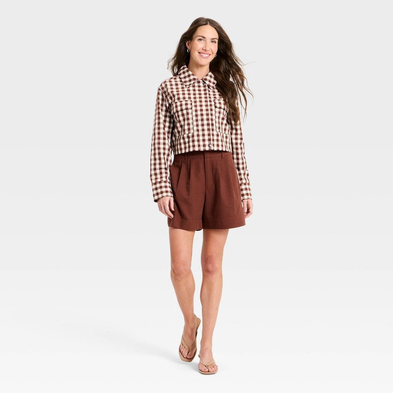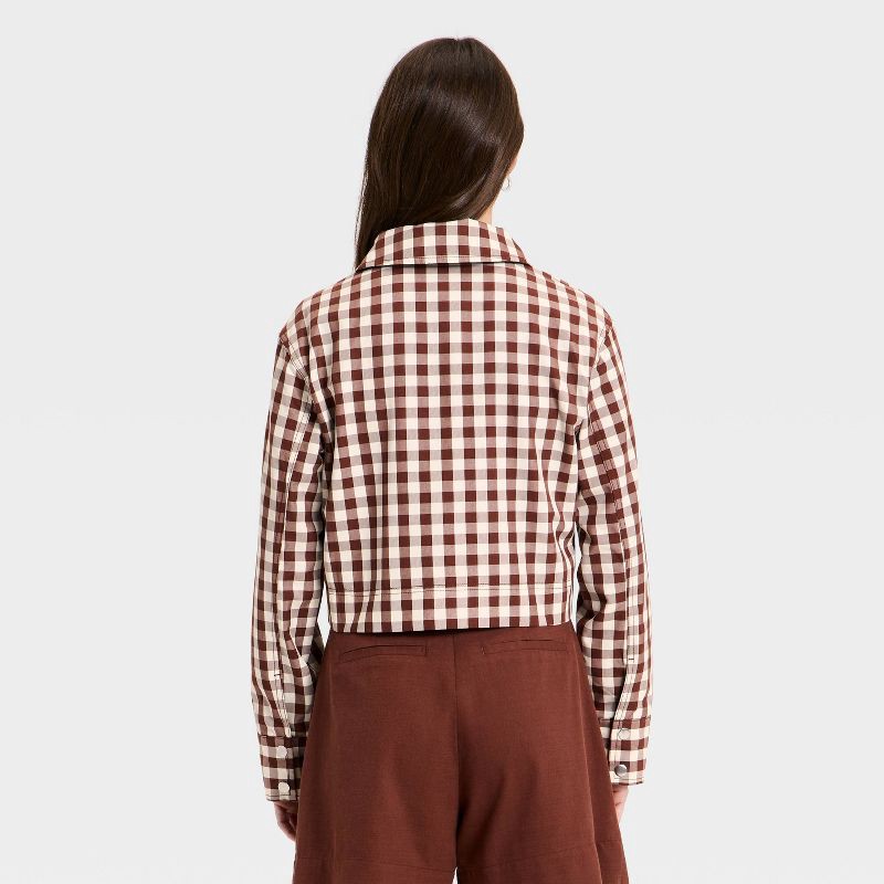 Women's Transitional Cropped Jacket - A New Day™ Brown Gingham M