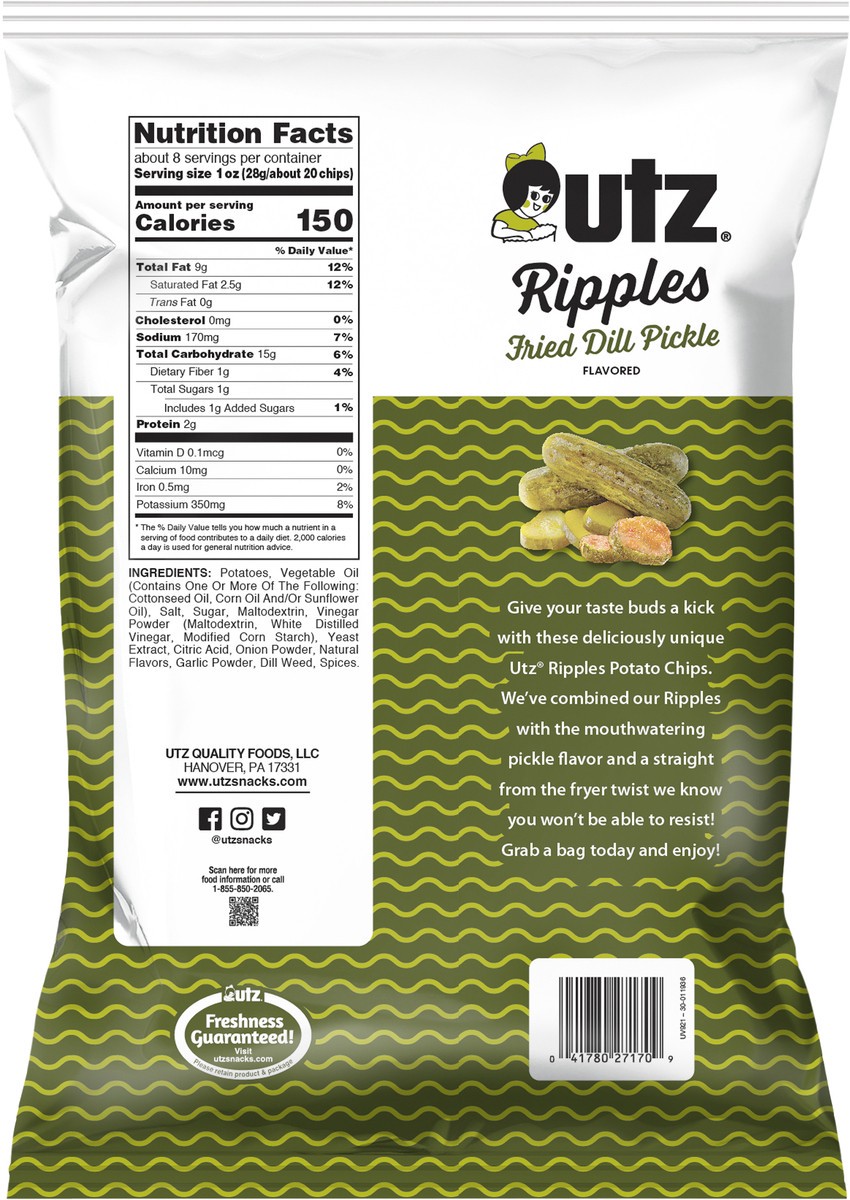 Family crafted flavor, since 1921. Give your taste buds a kick with these deliciously unique Utz Ripples Potato Chips. We've combined our Ripples with the mouthwatering pickle flavor and a straight fr…