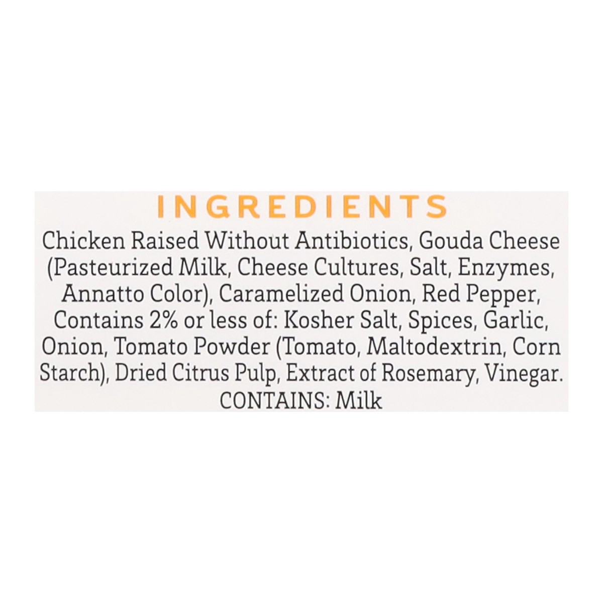 Chicken Raised Without Antibiotics, Gouda Cheese (Pasteurized Milk, Cheese Cultures, Salt, Enzymes, Annatto Color), Caramelized Onion, Red Pepper, Contains 2% or Less of: Kosher Salt, Spices, Garlic, …