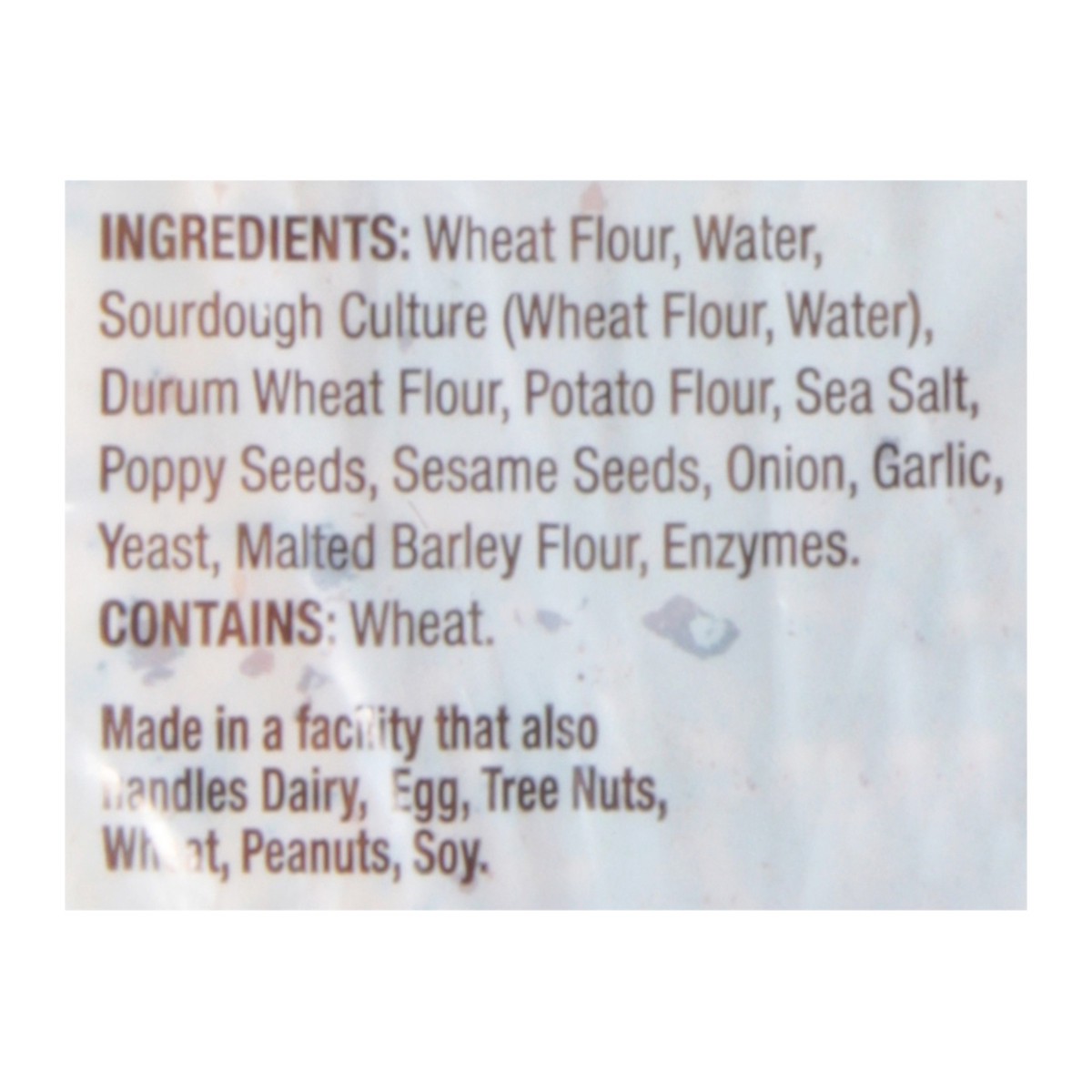 Wheat Flour, Water, Sourdough Culture (Wheat Flour, Water), Durum Wheat Flour, Potato Flour, Sea Salt, Poppy Seeds, Sesame Seeds, Onion, Garlic, Yeast, Malted Barley Flour, Enzymes.