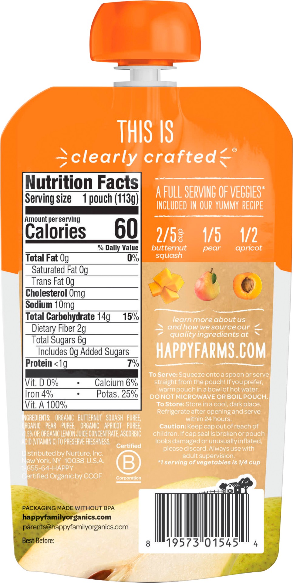 ORGANIC BUTTERNUT SQUASH PUREE, ORGANIC PEAR PUREE, ORGANIC APRICOT PUREE, <1.5% OF: ORGANIC LEMON JUICE CONCENTRATE, ASCORBIC ACID (VITAMIN C) TO PRESERVE FRESHNESS.