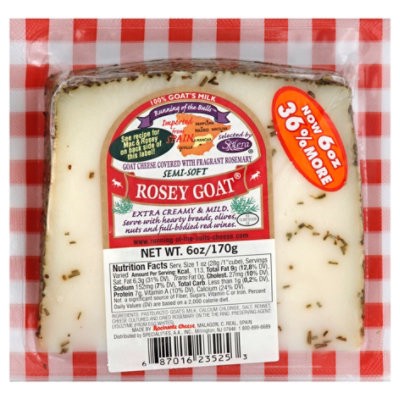 100% goat's milk. Now 6 oz - 36% more. Goat cheese covered with fragrant rosemary. Extra creamy & mild. Serve with hearty breads, olives, nuts and full-bodied red wines. www.running-of-the-bulls-chees…