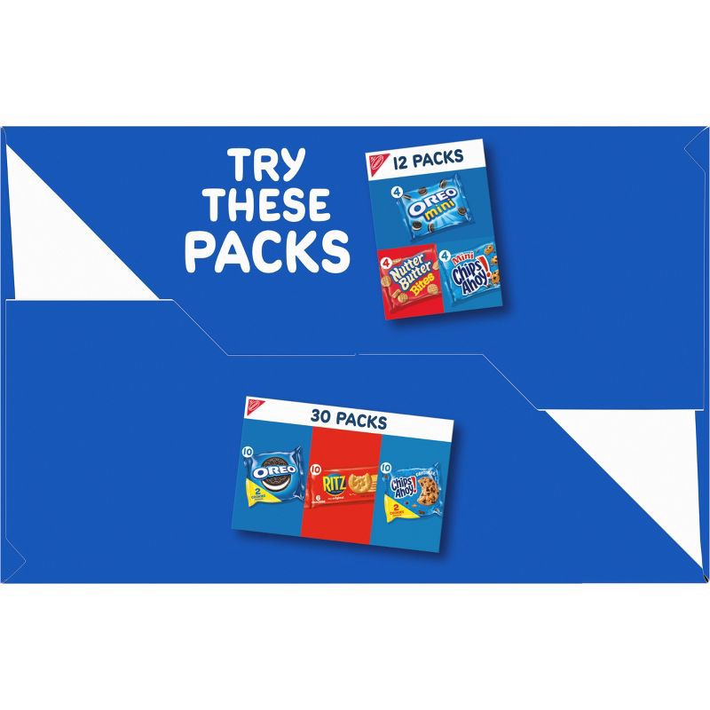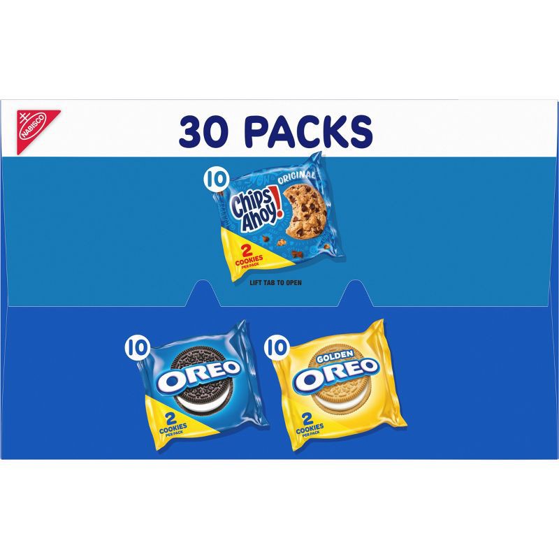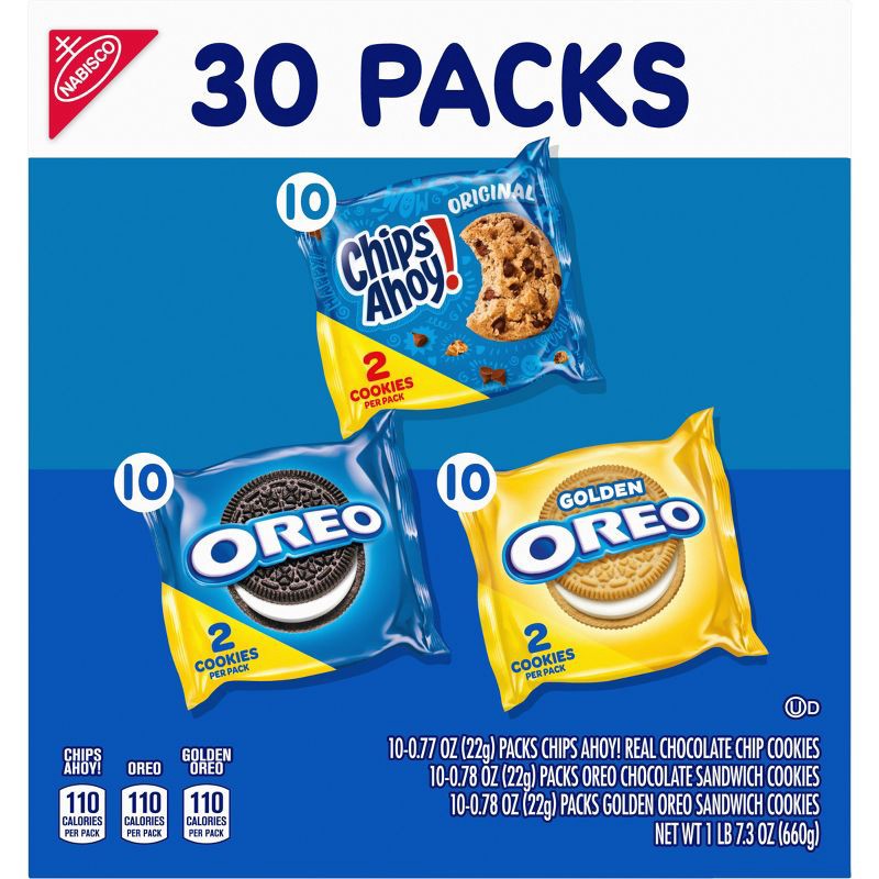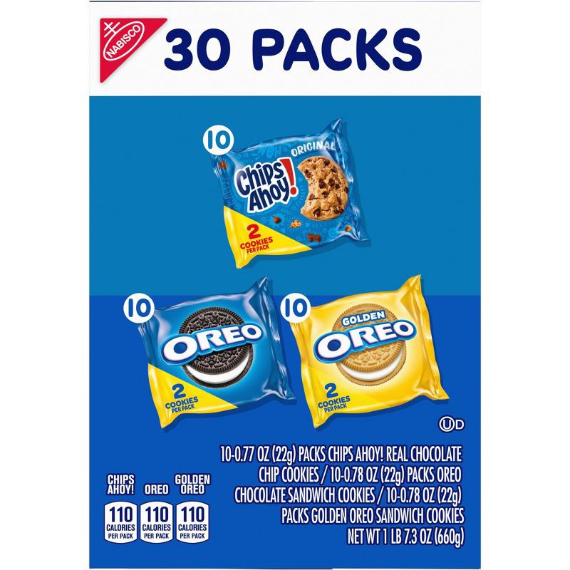 - One Nabisco Sweet Treats Cookie Variety Pack with 30 two-cookie snack packs, including 10 each of OREO Original, OREO Golden and CHIPS AHOY! (packaging may vary)
