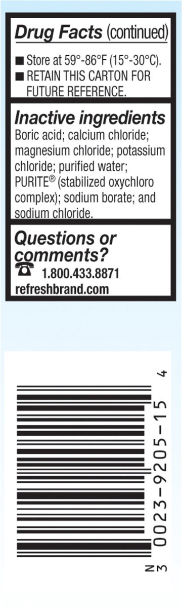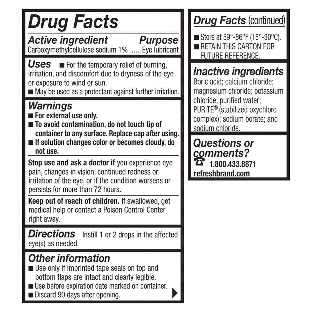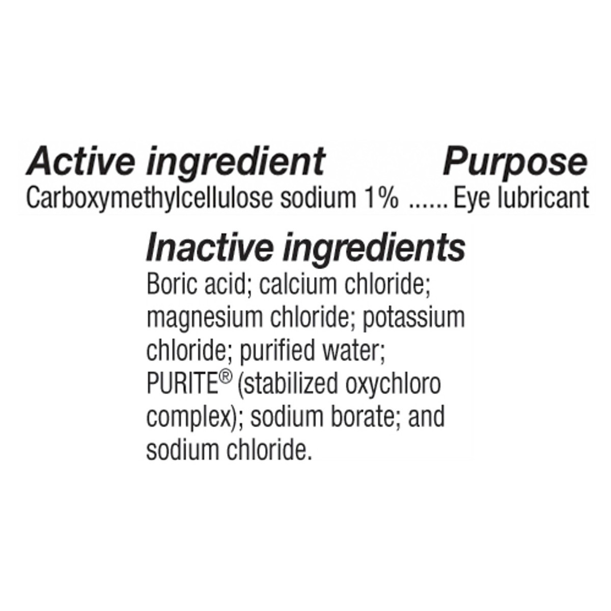 Active Ingredients: Carboxymethylcellulose Sodium (1 %), Eye Lubricant. Inactive Ingredients: Boric Acid, Calcium Chloride, Magnesium Chloride, Potassium Chloride, Purite (Stabilized Oxychloro Complex…