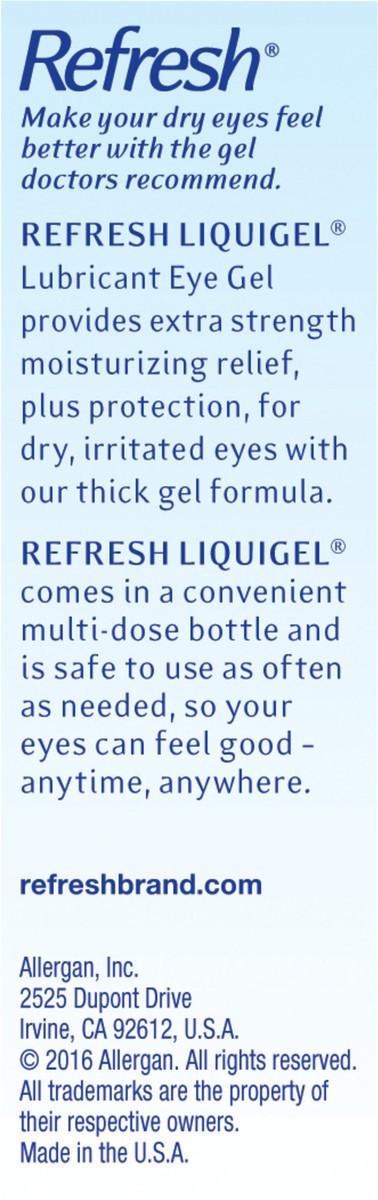 REFRESH LIQUIGEL Lubricant Eye Gel provides lasting relief from moderate dry eye symptoms, including burning, irritation, and discomfort. Its original strength gel formula delivers soothing hydration …