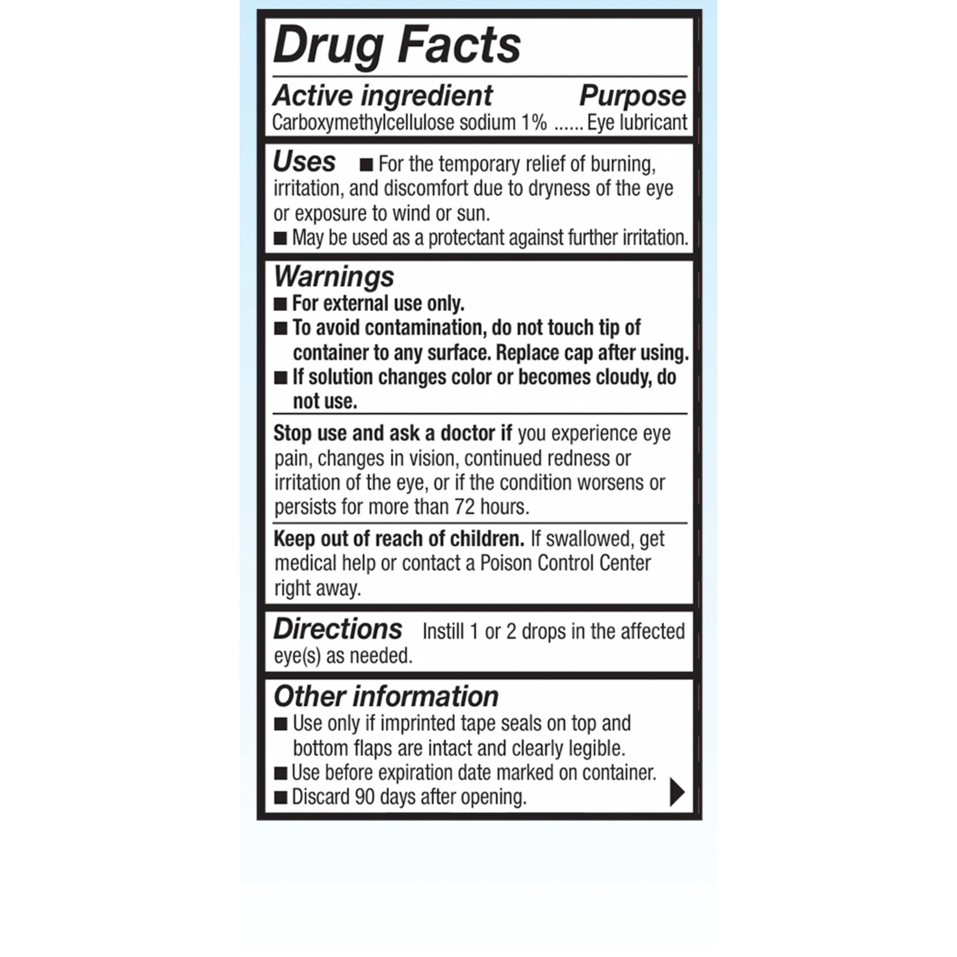 Active Ingredients: Carboxymethylcellulose Sodium (1 %), Eye Lubricant. Inactive Ingredients: Boric Acid, Calcium Chloride, Magnesium Chloride, Potassium Chloride, Purite (Stabilized Oxychloro Complex…
