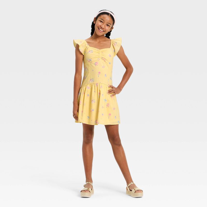 Girls' Flutter Sleeve Drop Waist Floral Dress - art class™ Yellow M
