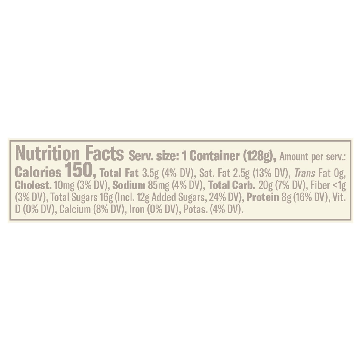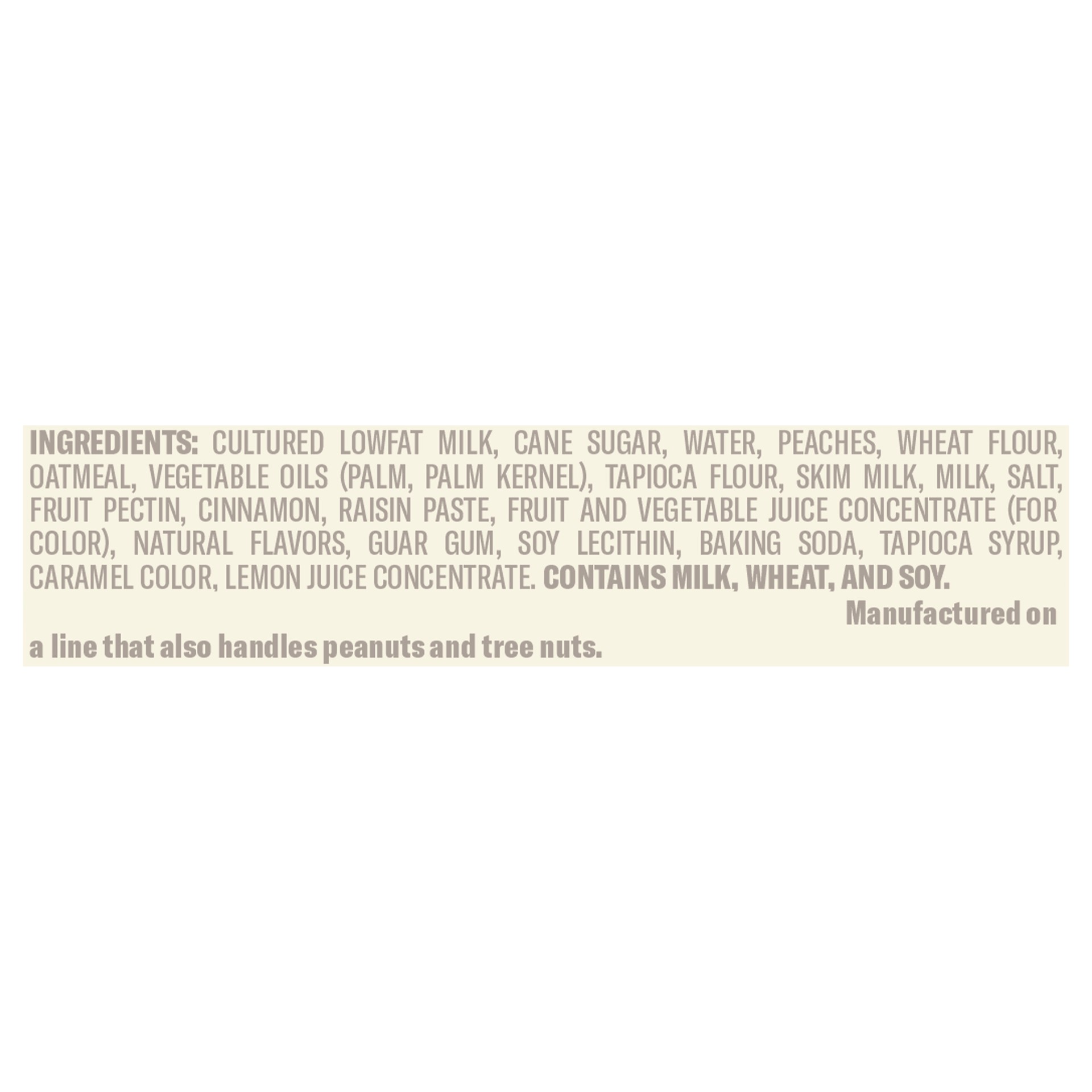 Cultured Lowfat Milk, Cane Sugar, Water, Peaches, Wheat Flour, Oatmeal, Vegetable Oils (Palm, Palm Kernel), Tapioca Flour, Skim Milk, Milk, Salt, Fruit Pectin, Cinnamon, Raisin Paste, Fruit and Vegeta…