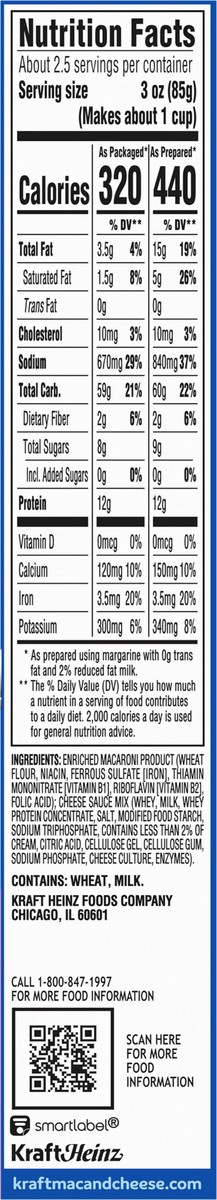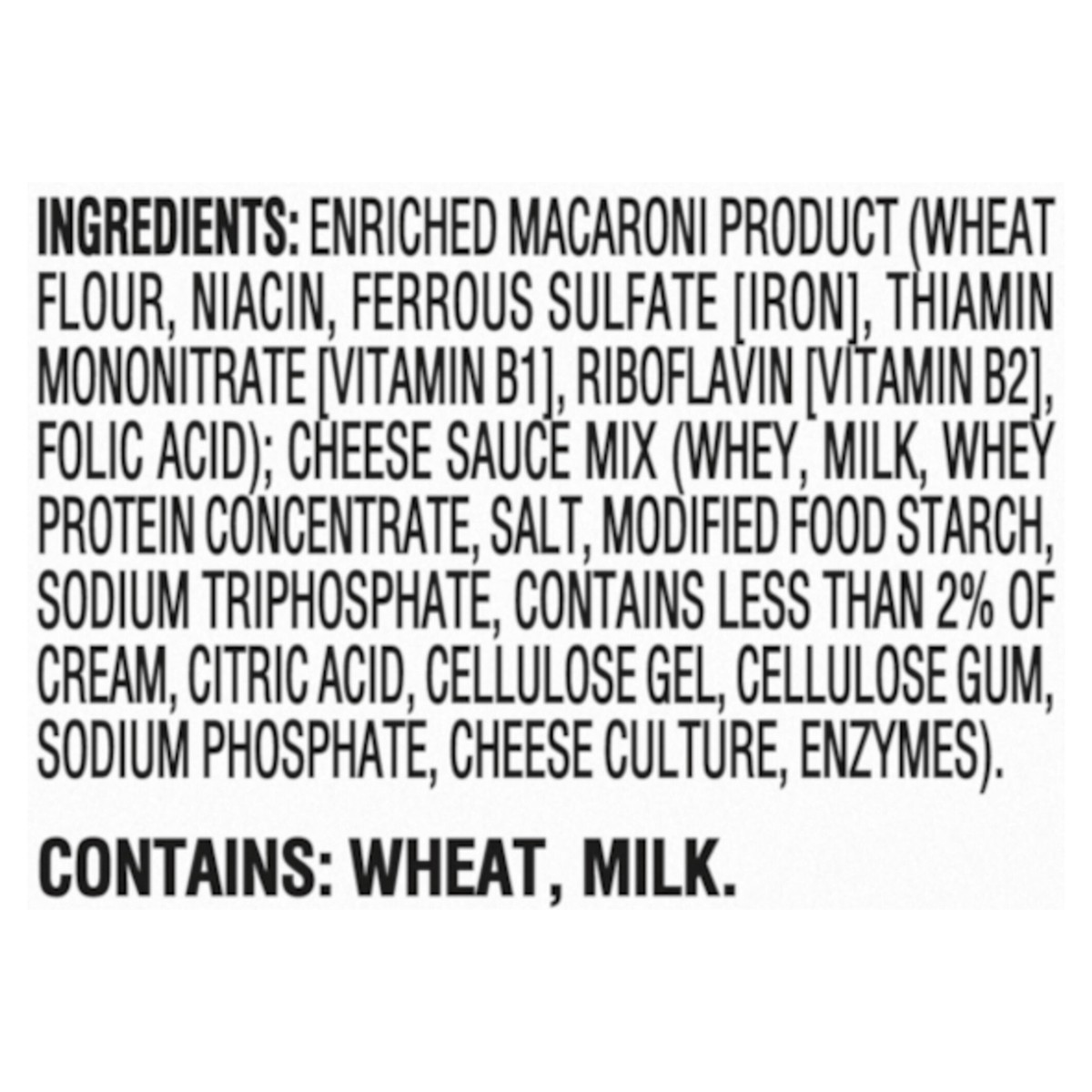 ENRICHED MACARONI PRODUCT (WHEAT FLOUR, NIACIN, FERROUS SULFATE [IRON], THIAMIN MONONITRATE [VITAMIN B1], RIBOFLAVIN [VITAMIN B2], FOLIC ACID); CHEESE SAUCE MIX (WHEY, MILK, WHEY PROTEIN CONCENTRATE, …