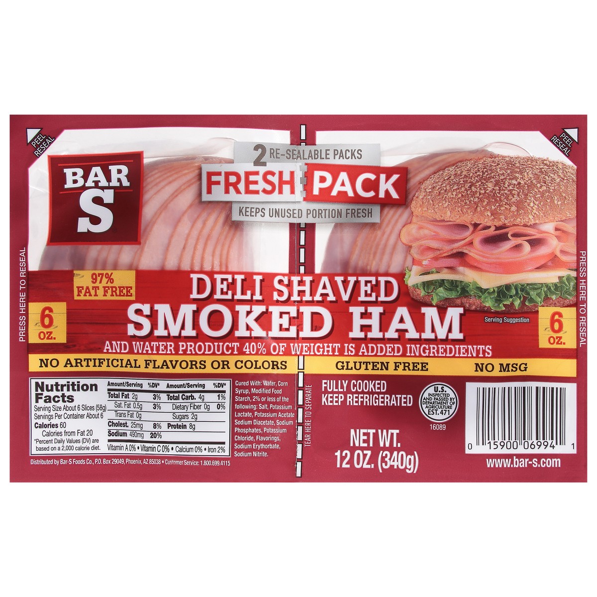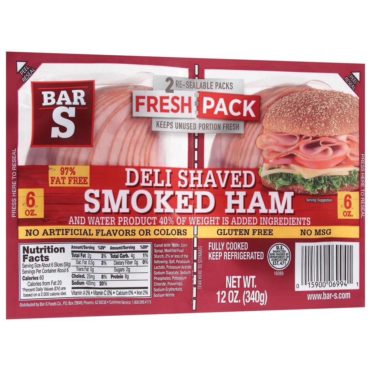 Bar-S Deli Shaved Smoked Ham Fresh Pack 2 - 6 oz Packs