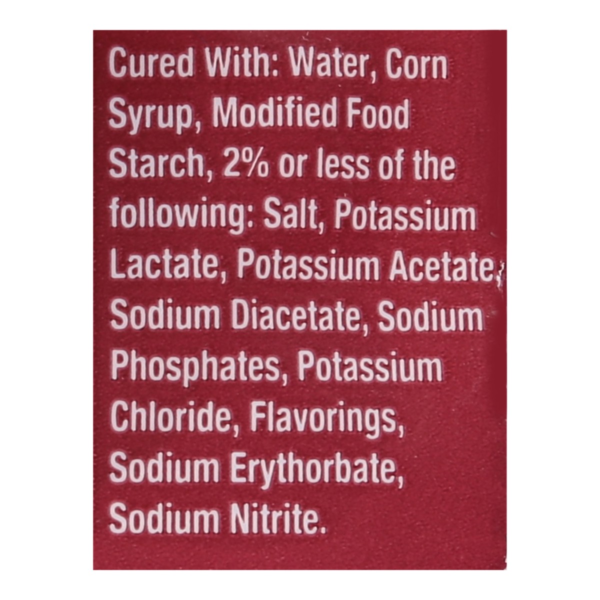 Cured with: Water, Corn Syrup, Modified Food Starch, 2% or Less of the Following: Salt, Potassium Lactate, Potassium Acetate, Sodium Diacetate, Sodium Phosphates, Potassium Chloride, Flavorings, Sodiu…