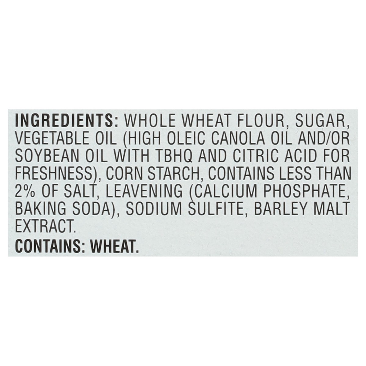 Whole Wheat Flour, Sugar, Vegetable Oil (High Oleic Canola Oil and/or Soybean Oil with TBHQ and Citric Acid for Freshness), Corn Starch, Contains Less than 2% of Salt, Leavening (Calcium Phosphate, Ba…