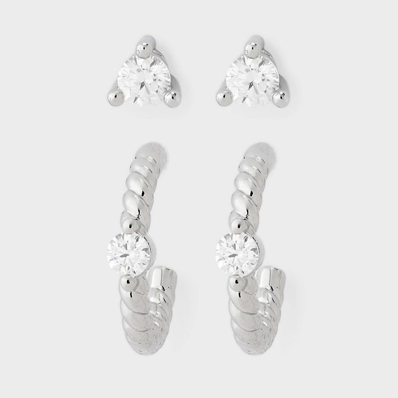 Switch up your style with this 2-Piece Stud and Hoop Earring Set from A New Day™. This silver-tone set includes a pair of sparkly CZ studs and a pair of twisted rope-style open hoops featuring a round…
