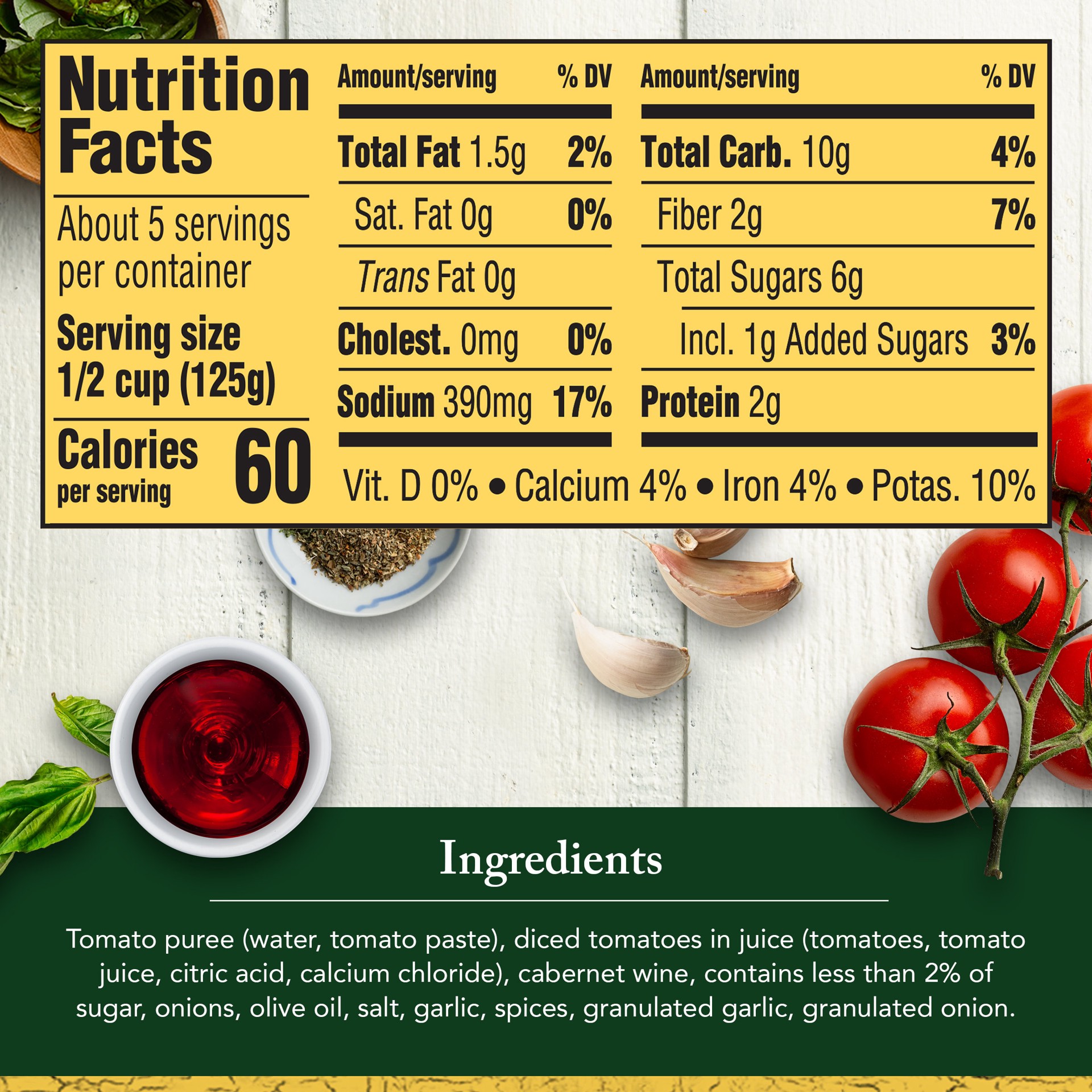 TOMATO PUREE (WATER, TOMATO PASTE), DICED TOMATOES IN JUICE (TOMATOES, TOMATO JUICE, CITRIC ACID, CALCIUM CHLORIDE), CABERNET WINE, CONTAINS LESS THAN 2% OF SUGAR, ONIONS, OLIVE OIL, SALT, GARLIC, SPI…
