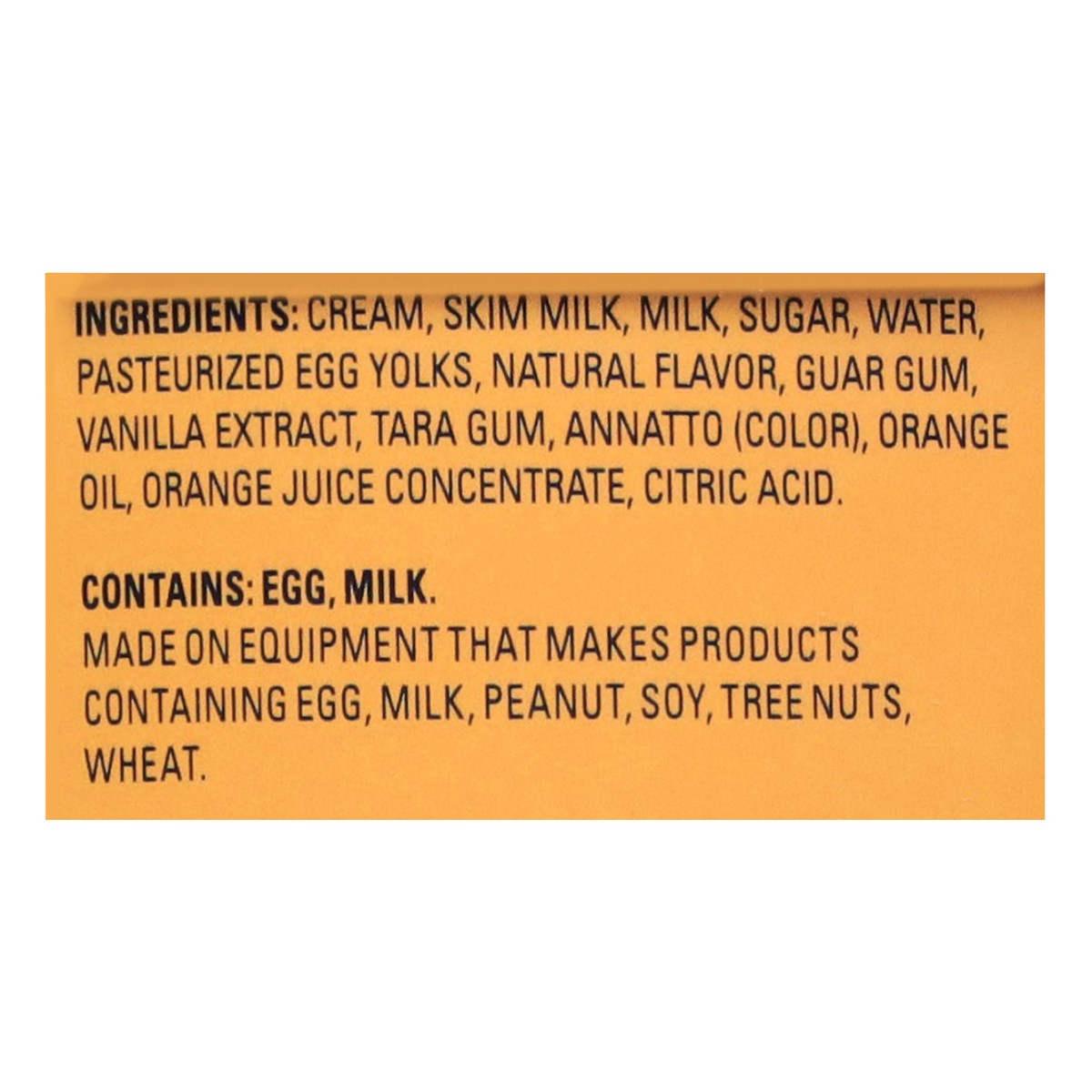 Cream, Skim Milk, Milk, Sugar, Water, Pasteurized Egg Yolks, Natural Flavor, Guar Gum, Vanilla Extract, Tara Gum, Annatto (Color), Orange Oil, Orange Juice Concentrate, Citric Acid.