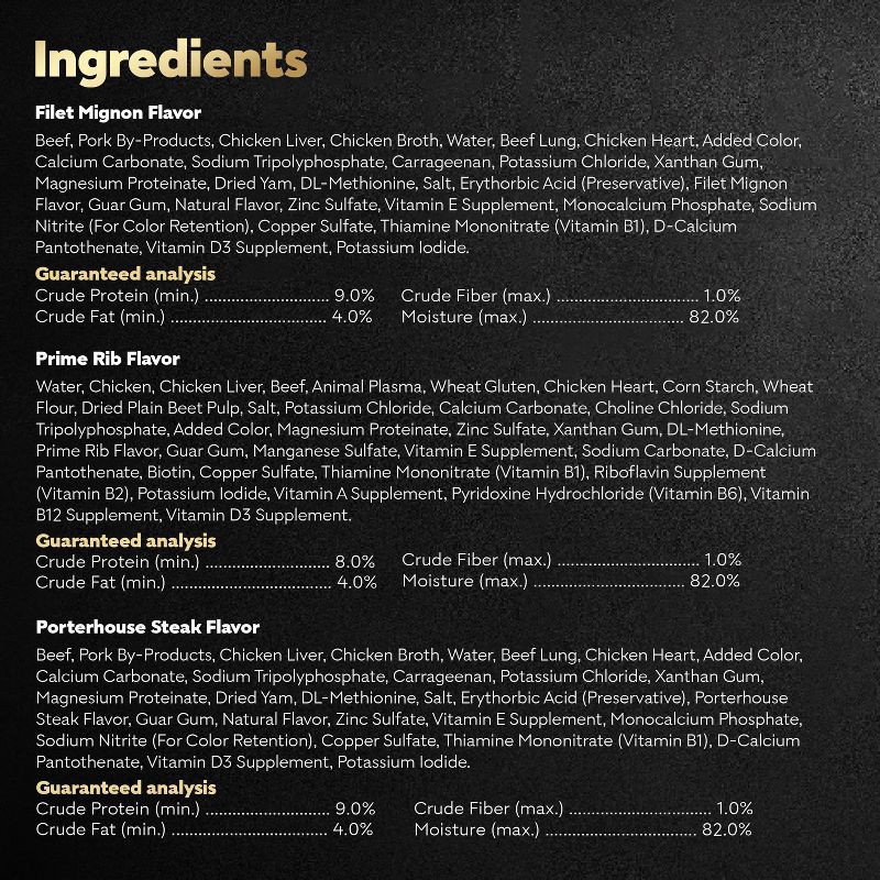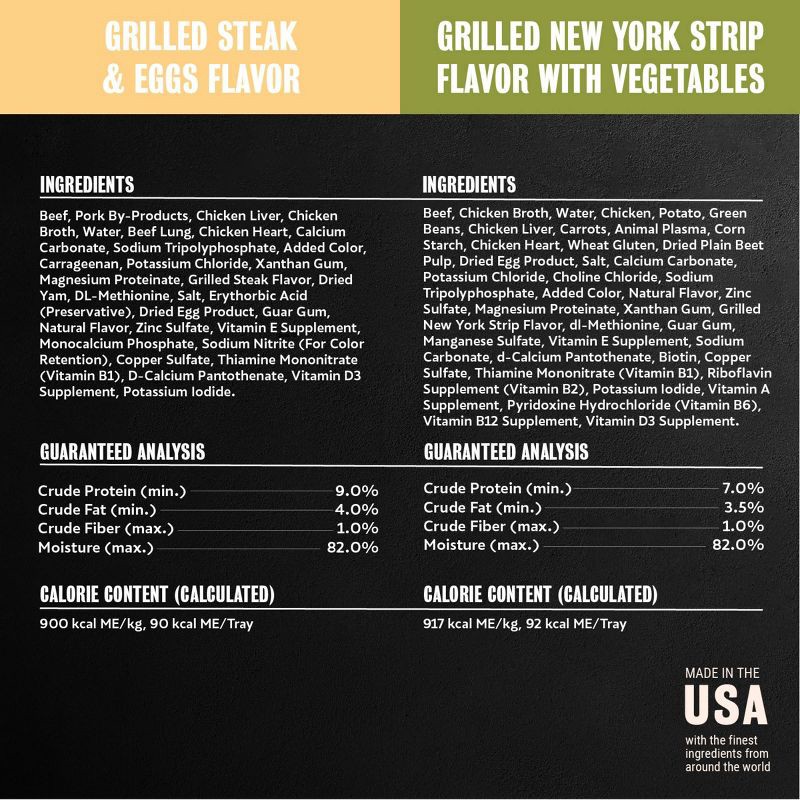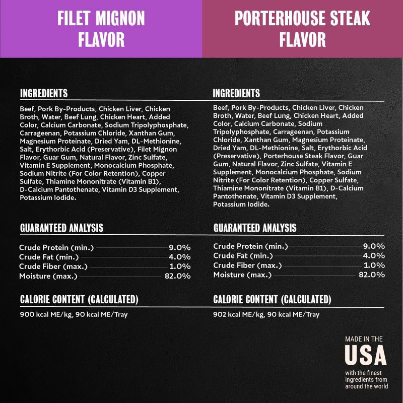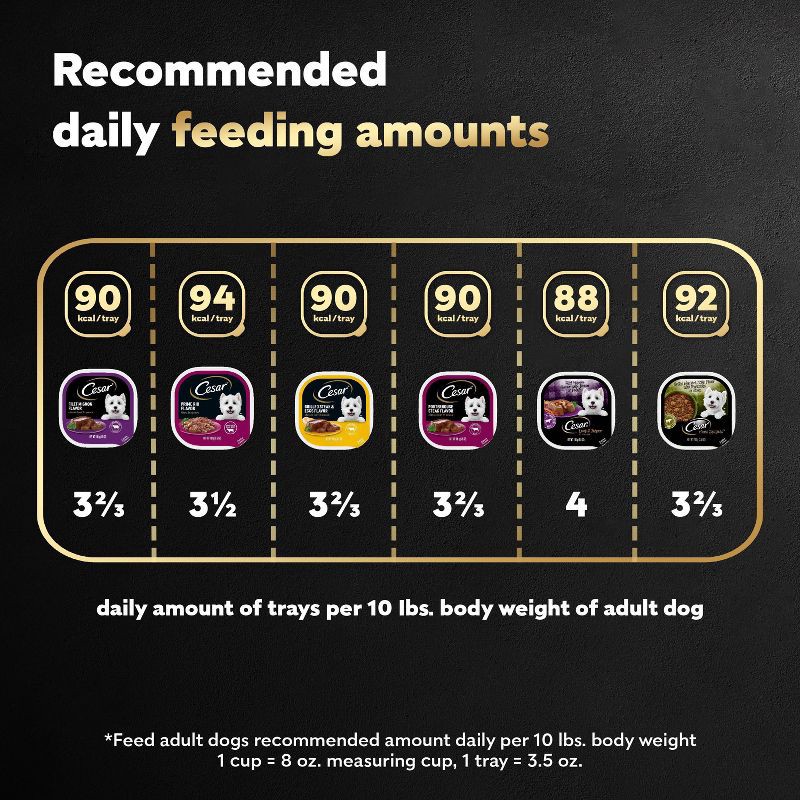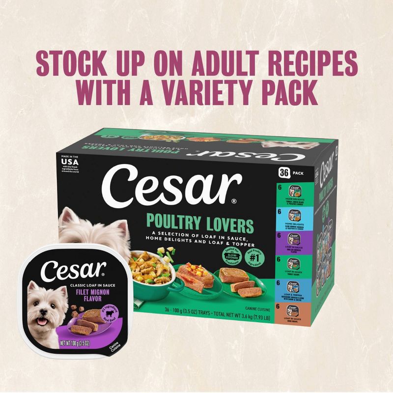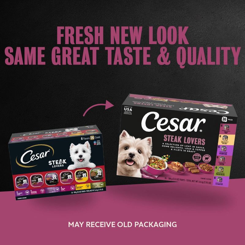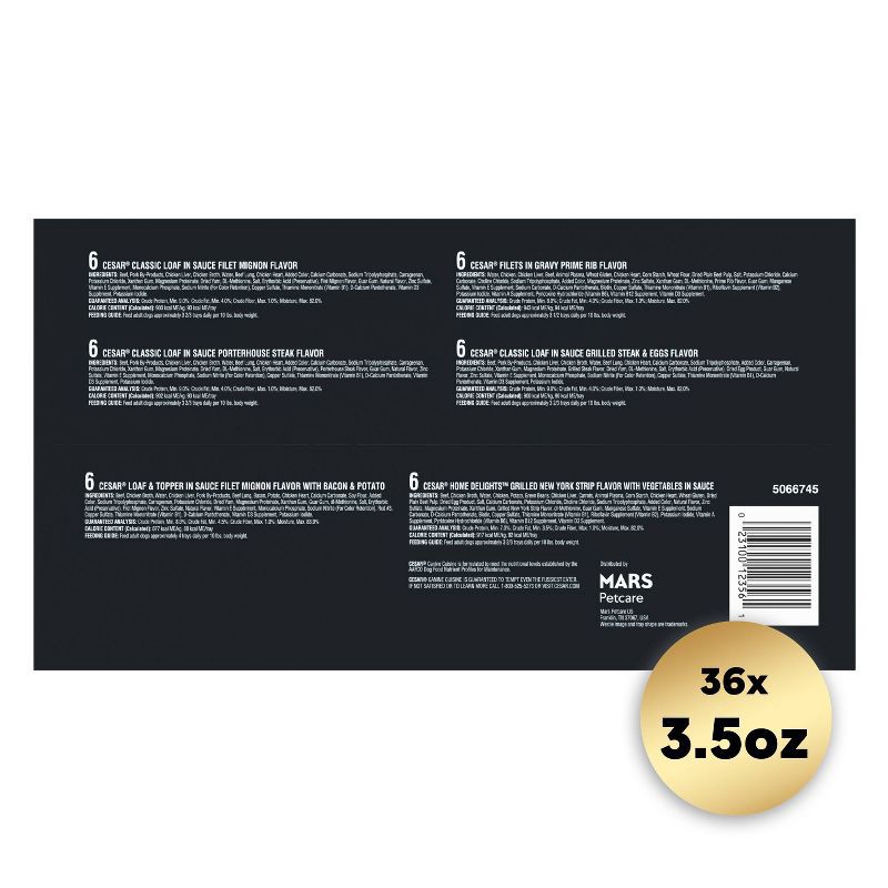 - Variety Pack: Contains thirty-six (36) 3.5 oz. easy-peel trays of Cesar Adult Soft Wet Dog Food Steak Lovers Variety Pack with Real Meat: (8) Classic Loaf in Sauce Filet Mignon Flavor, (8) Classic Loaf in Sauce Porterhouse Steak Flavor; (8) Loaf & Topper Filet Mignon Flavor with Bacon and Potatoes; (8) Filets in Gravy Prime Rib Flavor, (8) Classic Loaf in Sauce Steak & Egg Flavor, (8) Home Delights Grilled NY Strip Flavor with Vegetables in Sauce.