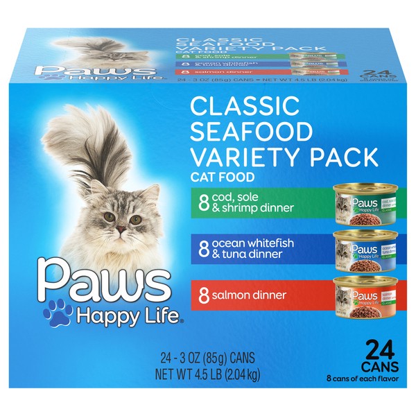 Cod, Sole & Shrimp Dinner Calorie Content (Calculated): Metabolizable Energy (ME) 915 kcal/kg, 78 kcal/can. Paws Happy Life Classic Cod, Sole & Shrimp Dinner Cat Food is formulated to meet the nutriti…