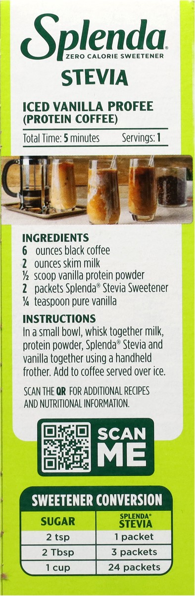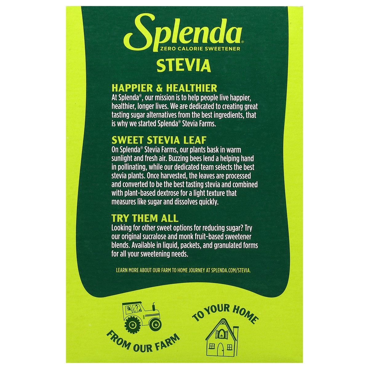 Sprinkle Sweetness! Introducing Splenda® Stevia Sweetener, a sweet breakthrough in zero calorie sweeteners. Where some stevia sweeteners may have a bitter aftertaste, Splenda Stevia is sweet—without t…
