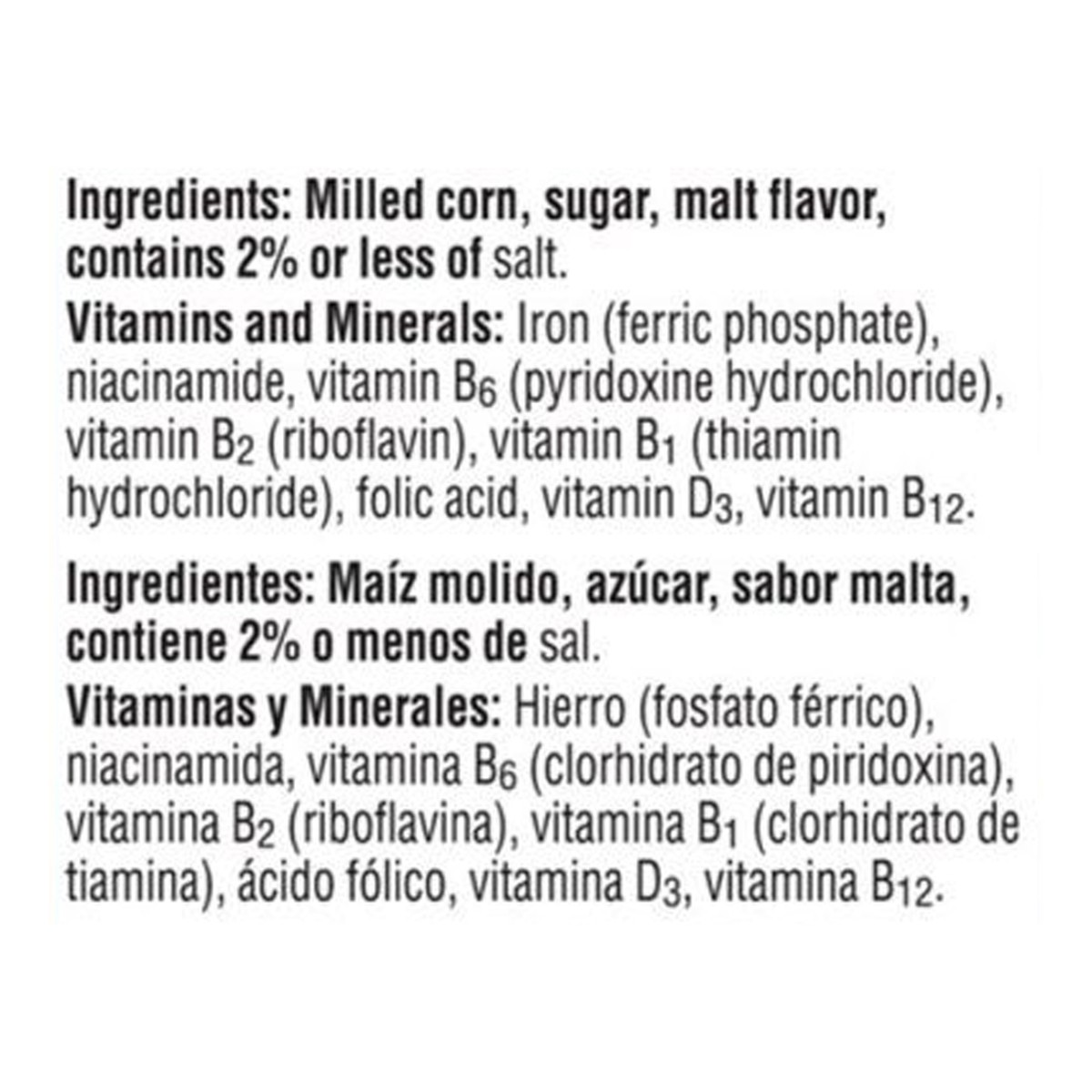 Milled Corn, Sugar, Malt Flavor, Contains 2% or Less of Salt, Vitamins and Minerals: Iron (Ferric Phosphate), Niacinamide, Vitamin B6 (Pyridoxine Hydrochloride), Vitamin B2 (Riboflavin), Vitamin B₁ (T…