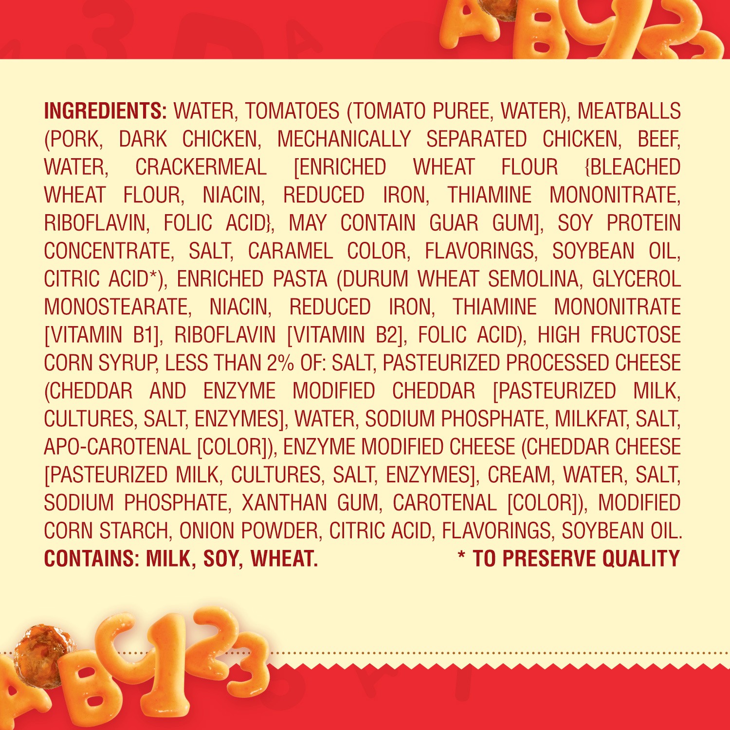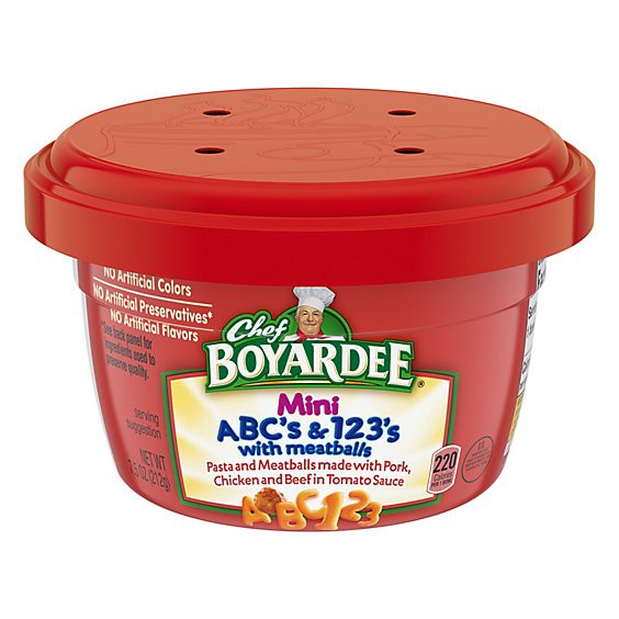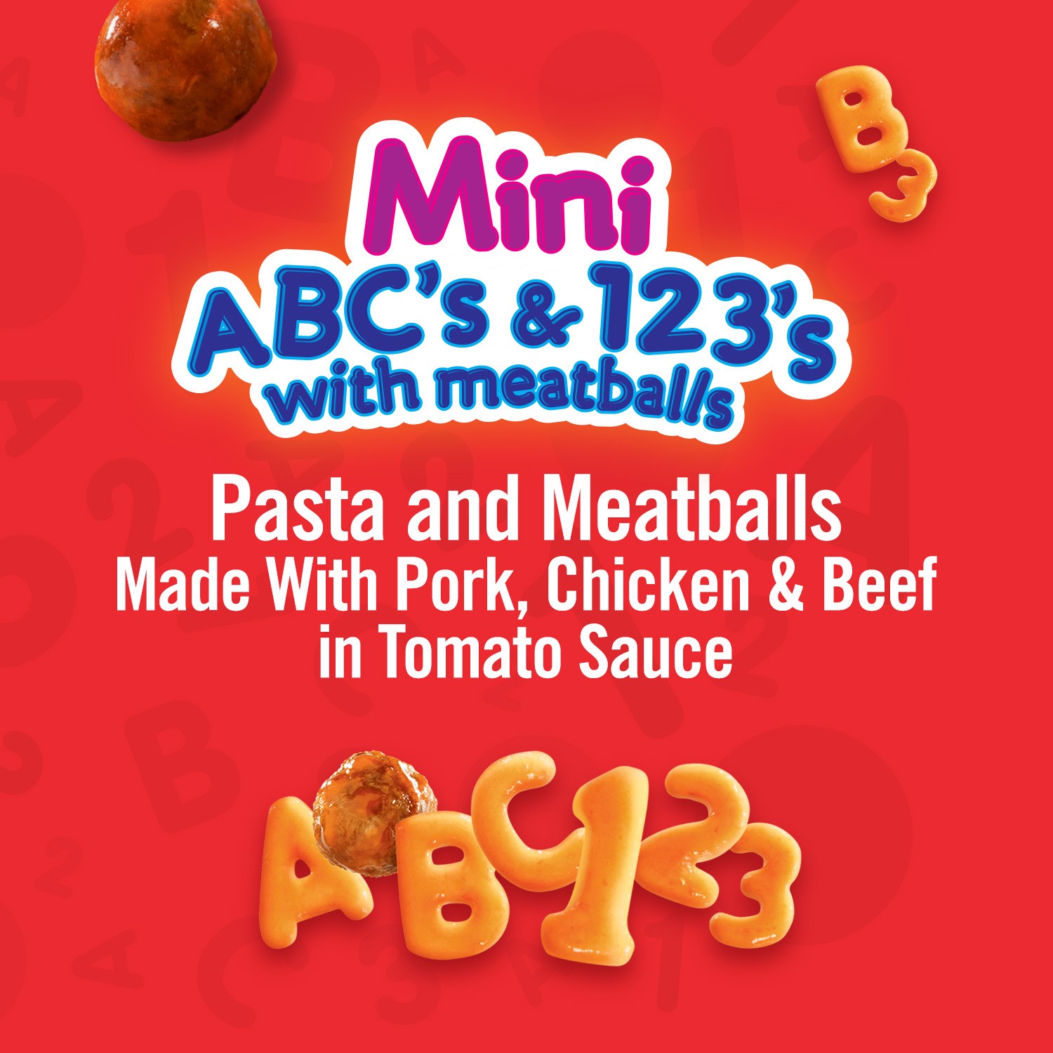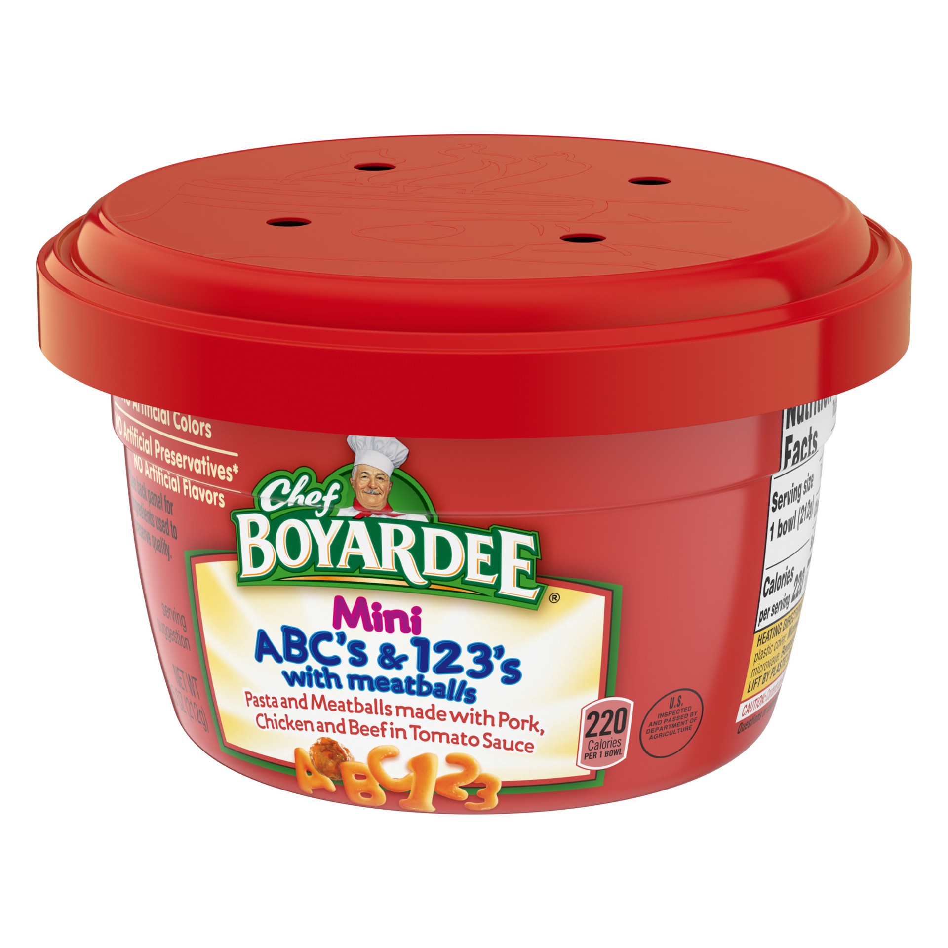 For a fun and tasty treat, try Chef Boyardee Mini ABC''s & 123''s with Meatballs. Each meal has fun pasta shapes and meatballs in a creamy tomato sauce for a pasta combo your little ones are sure to l…