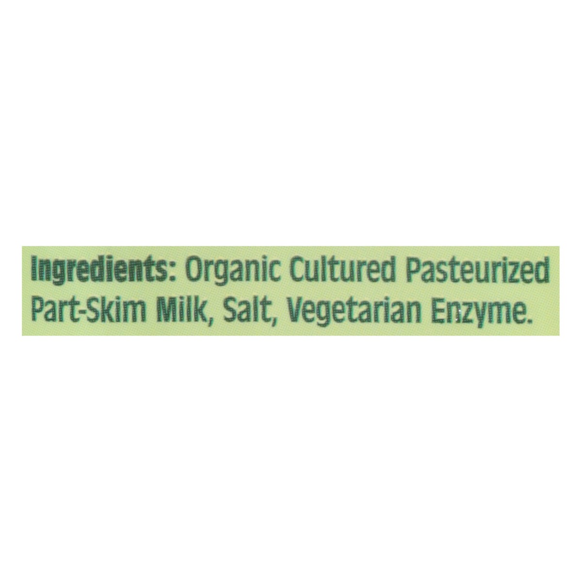 Organic Cultured Pasteurized Part Skim Milk, Salt, Vegetarian Enzyme.