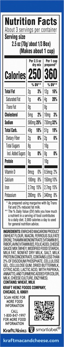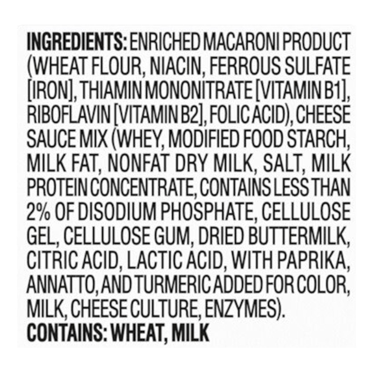 ENRICHED MACARONI PRODUCT (WHEAT FLOUR, NIACIN, FERROUS SULFATE [IRON], THIAMIN MONONITRATE [VITAMIN B1], RIBOFLAVIN [VITAMIN B2], FOLIC ACID); CHEESE SAUCE (WHEY, MODIFIED FOOD STARCH, SALT, MILKFAT,…