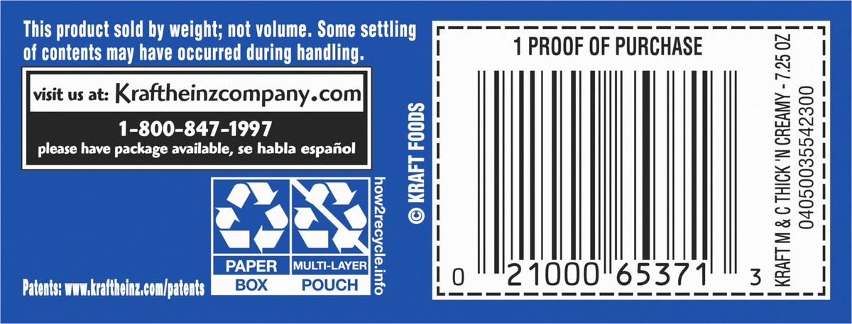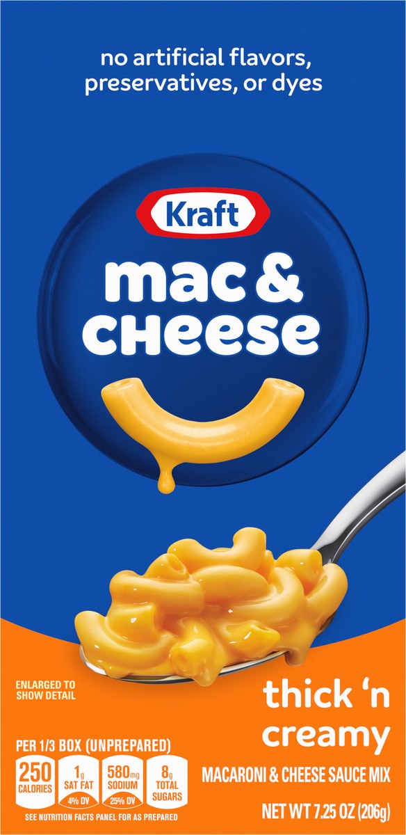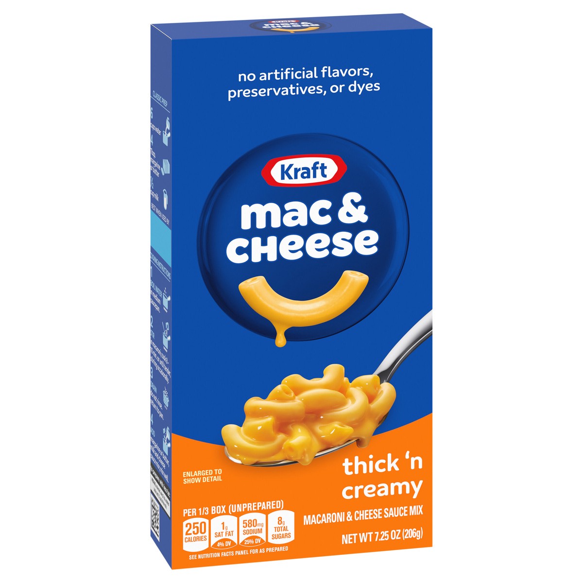 Help yourself to a bowl of comfort. Kraft Thick 'n Creamy Mac & Cheese Dinner is a convenient boxed dinner. Kids and adults love the delicious taste of macaroni with cheesy goodness. Our 7.25 ounce ma…