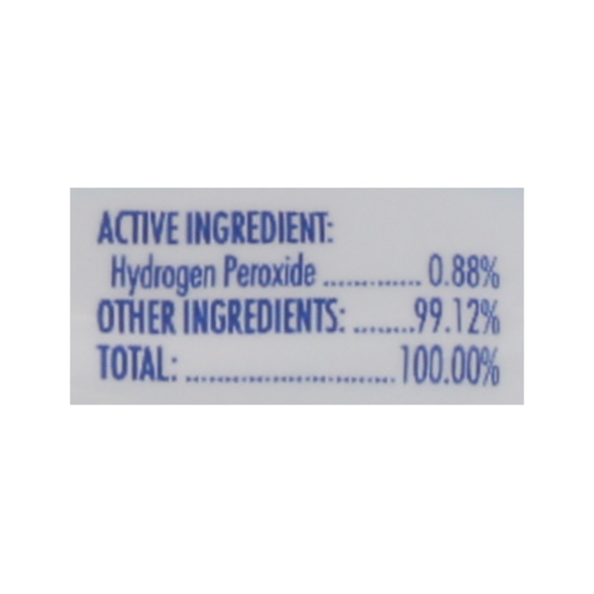 Active Ingredient: Hydrogen Peroxide (0.88%), Other Ingredients: (99.12%), Total (100.00%).