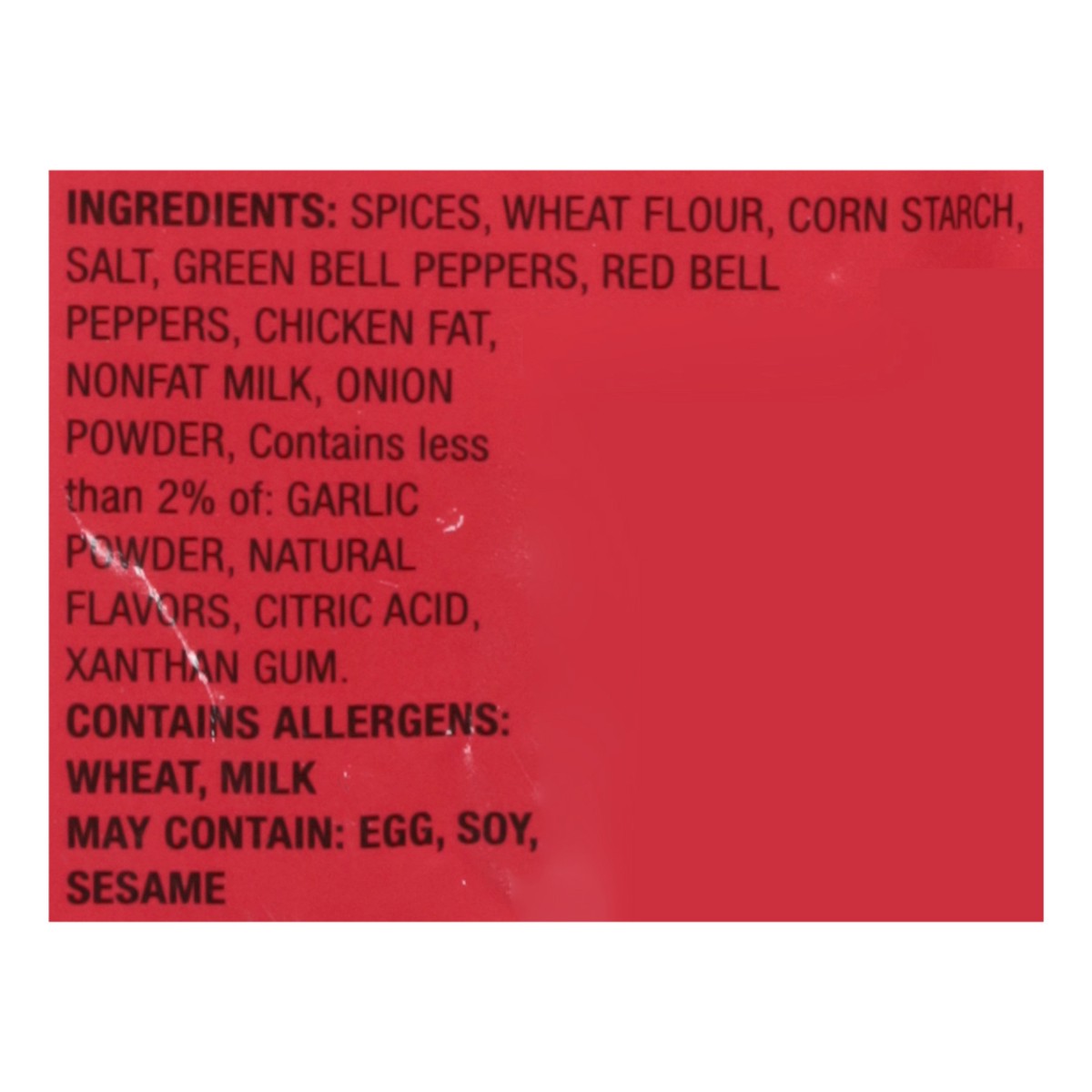 Spices, Wheat Flour, Corn Starch, Salt, Green Bell Peppers, Red Bell Peppers, Chicken Fat, Nonfat Milk, Onion Powder, Contains Less than 2% of: Garlic Powder, Natural Flavors, Citric Acid, Xanthan Gum…