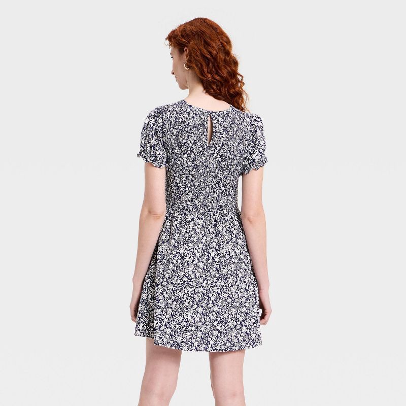 Women's Puff Short Sleeve Smocked Mini Sundress - Universal Thread™ Navy Blue Floral XS