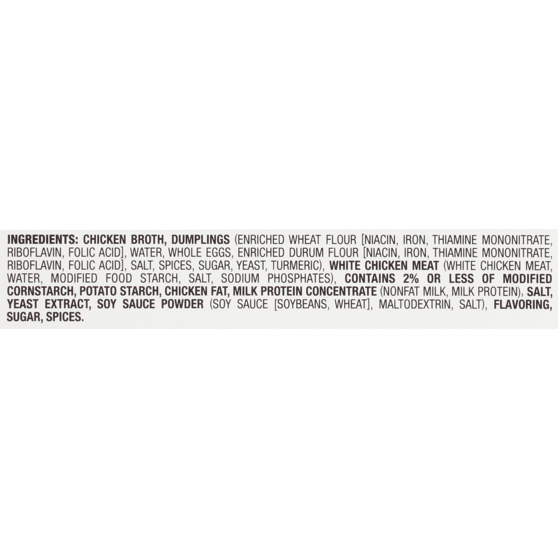 MADE WITH WHITE CHICKEN MEATIngredients: Chicken Broth, Dumplings (Enriched Wheat Flour [Niacin, Iron, Thiamine Mononitrate, Riboflavin, Folic Acid], Water, Whole Eggs, Enriched Durum Flour [Niacin, I…