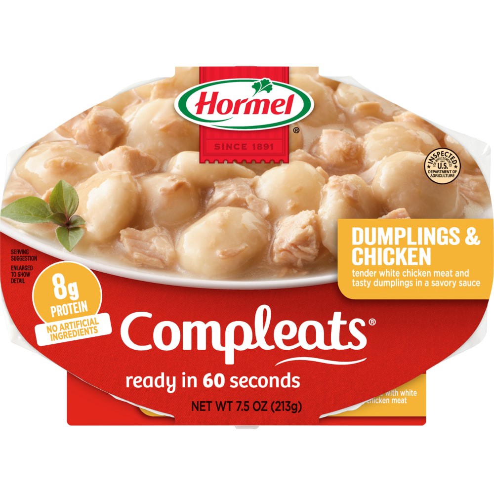 Tender white chicken meat and tasty dumplings in a savory sauce. 8 g protein. No artificial ingredients. Made with white chicken. Ready in 60 seconds. Since 1891. Inspected for wholesomeness by US Dep…