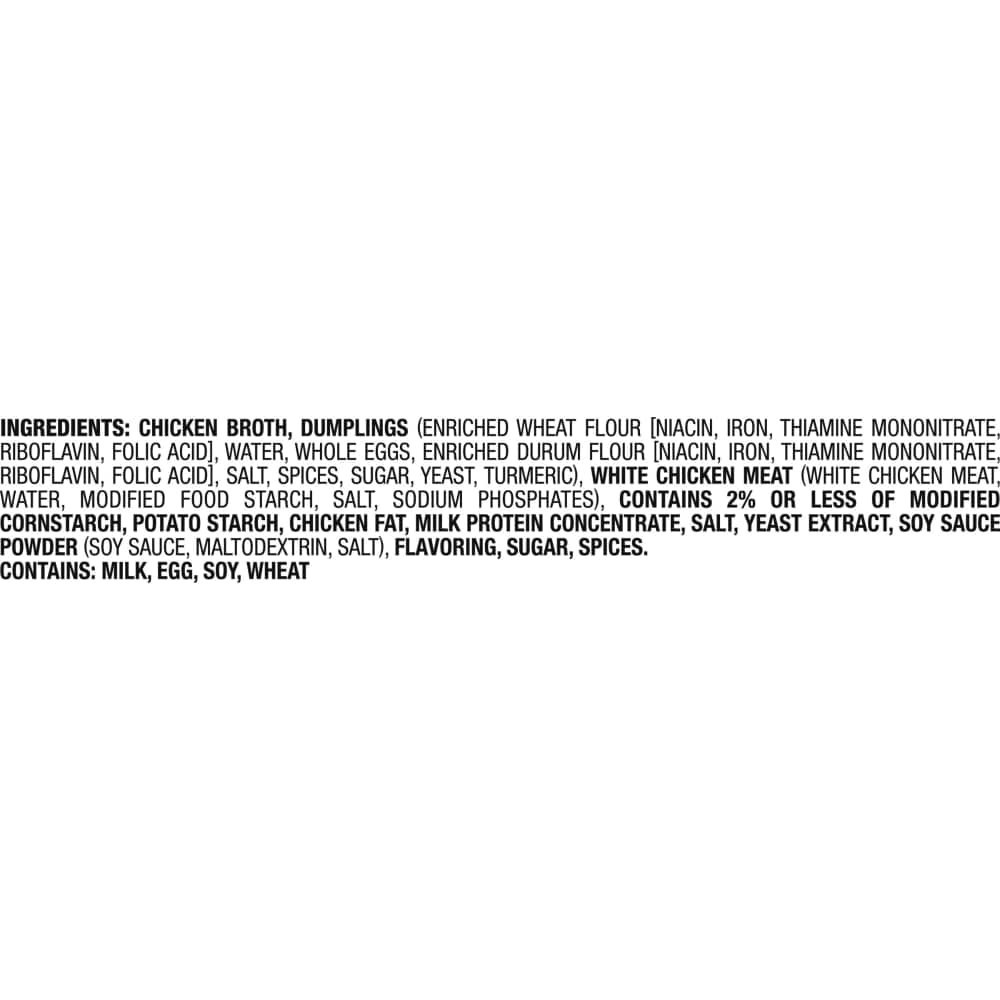 MADE WITH WHITE CHICKEN MEAT Ingredients: Chicken Broth, Dumplings (Enriched Wheat Flour [Niacin, Iron, Thiamine Mononitrate, Riboflavin, Folic Acid], Water, Whole Eggs, Enriched Durum Flour [Niacin, …