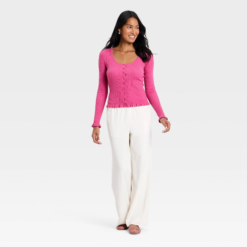 Women's Ruffle Scoop Neck Cardigan - A New Day™ Dark Pink L
