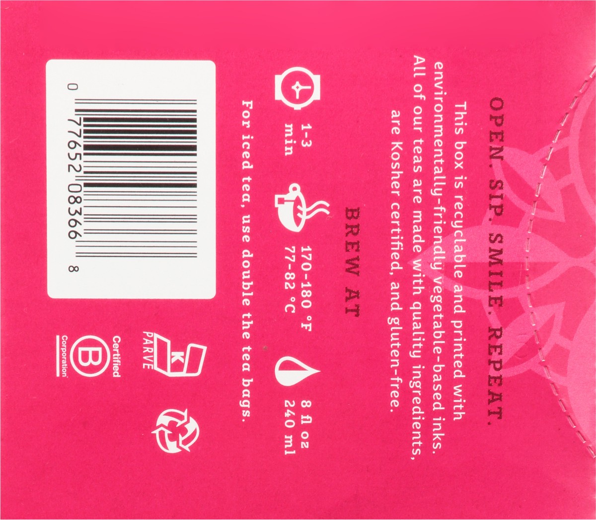 Green Tea, Hibiscus, Orange Peel, Chamomile, Natural Pomegranate Flavor, Natural Raspberry Flavor, Citric Acid, Matcha.