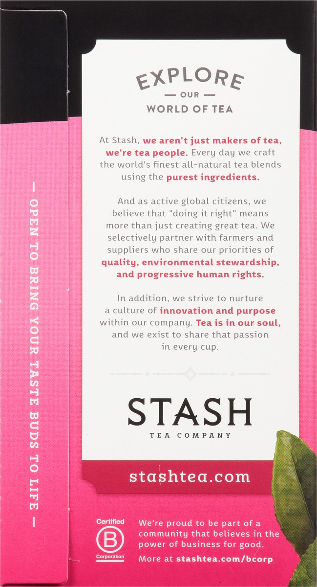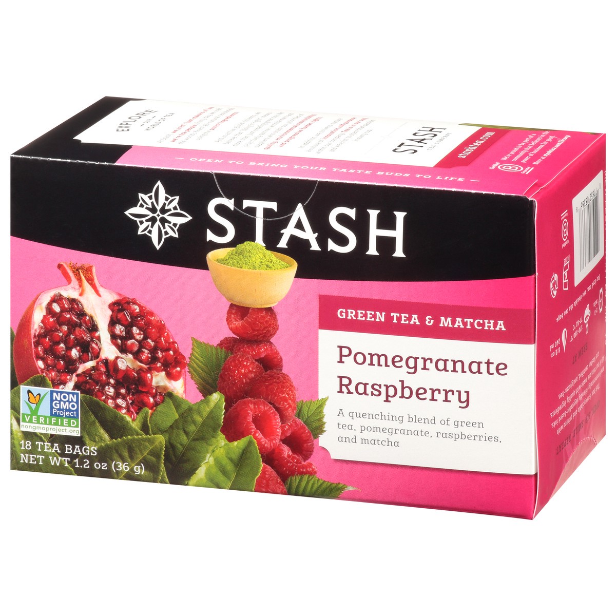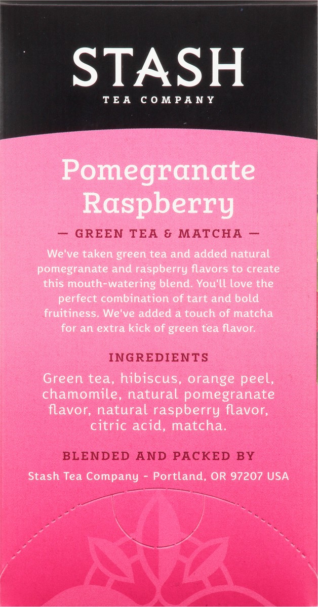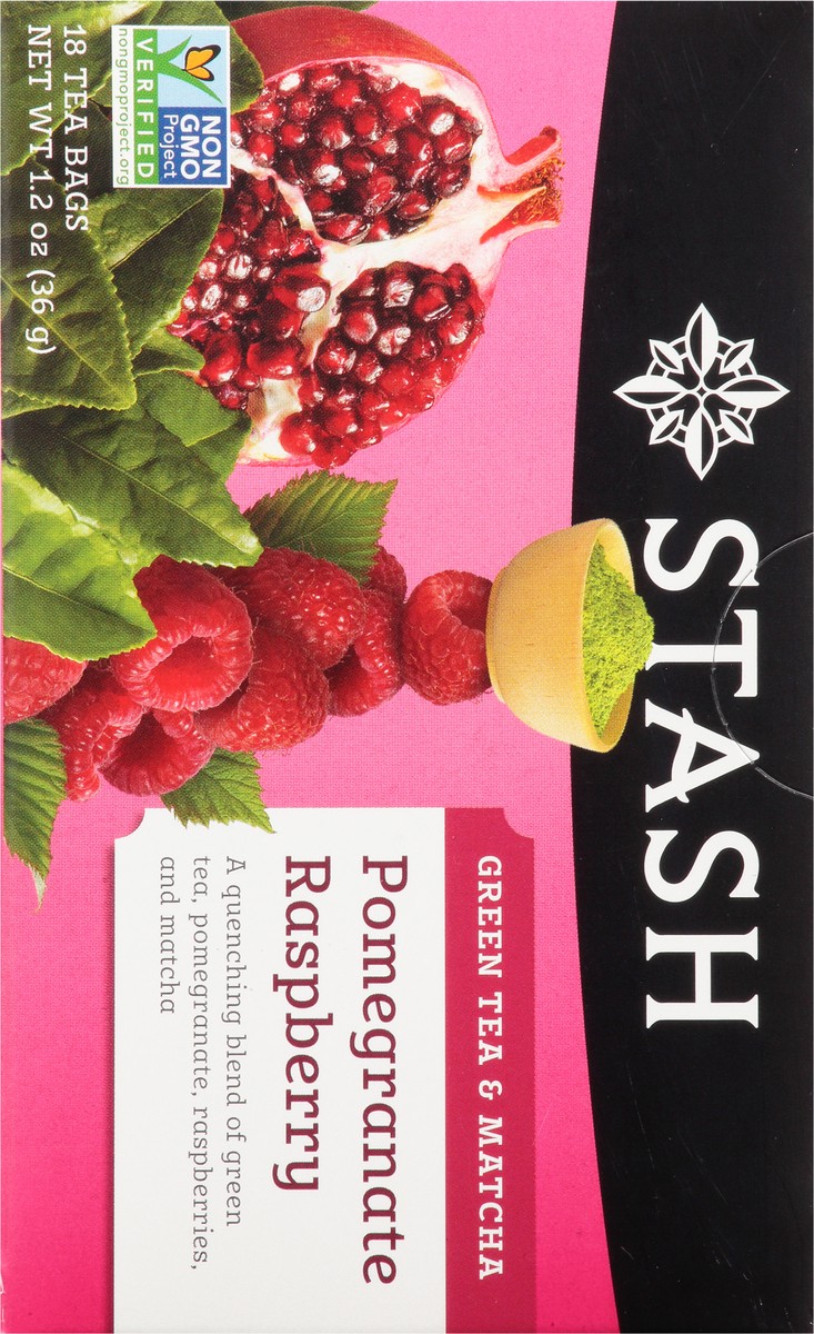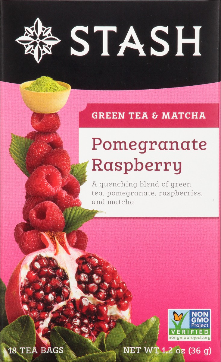 Non-GMO Project verified. nongmoproject.org. A quenching blend of green tea, pomegranate, raspberries, and matcha. Stash Tea Company. Estd. 1972. We've taken green tea and added natural pomegranate an…
