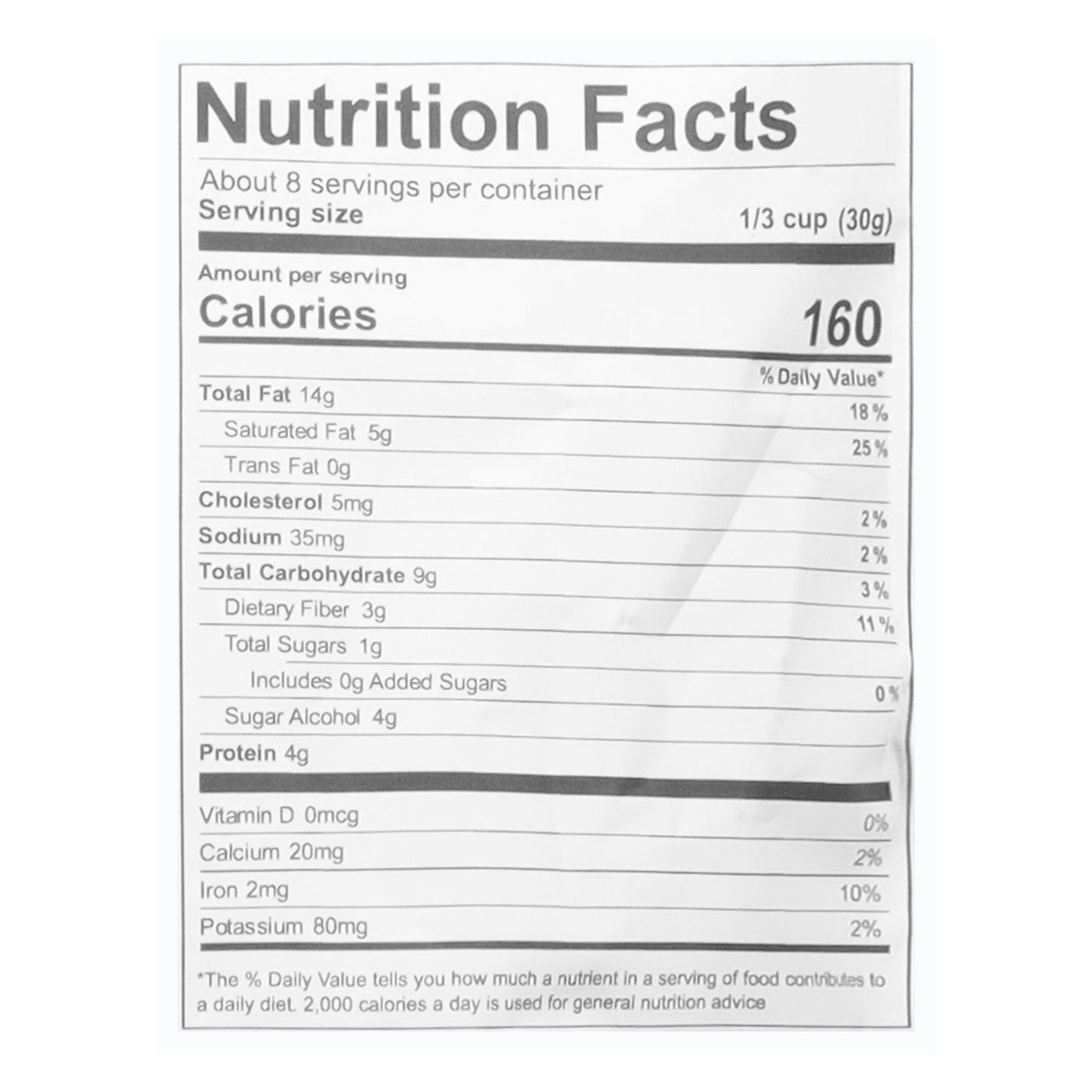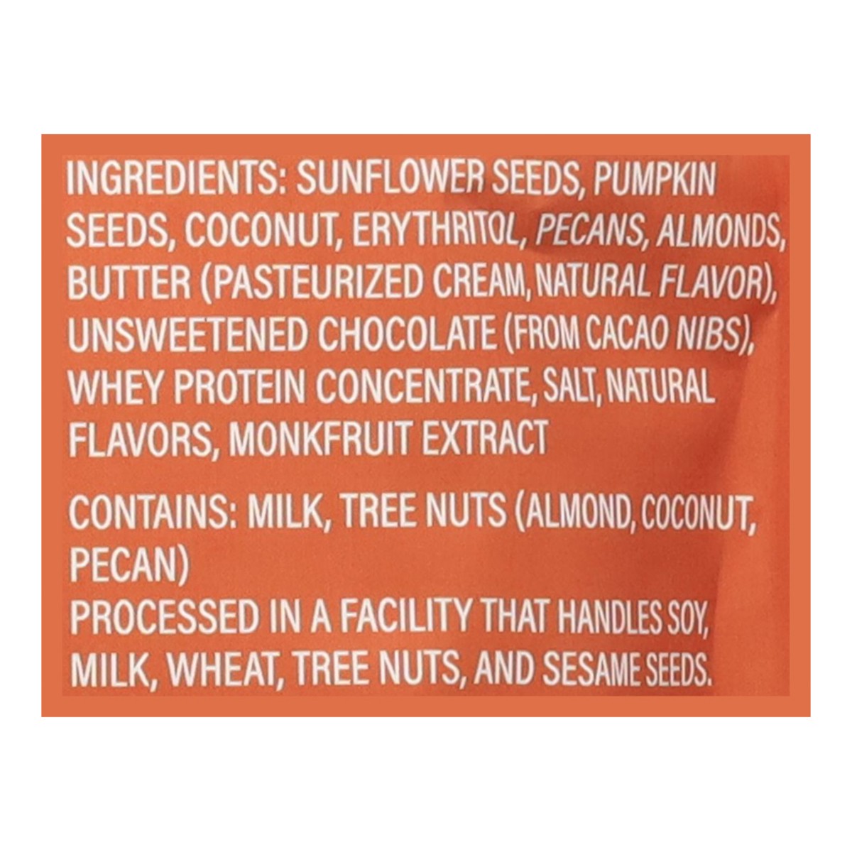 Sunflower Seeds, Pumpkin Seeds, Coconut, Erythritol, Pecans, Almonds, Butter (Pasteurized Cream, Natural Flavor), Unsweetened Chocolate, Whey Protein Concentrate, Salt, Natural Flavors, Monk Fruit Ext…