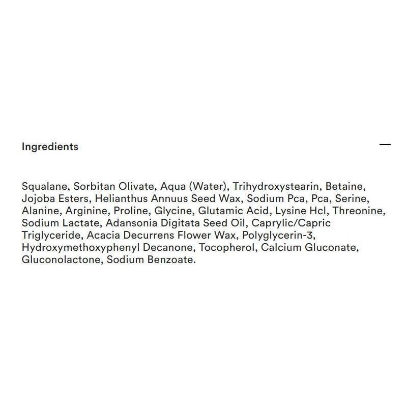 SQUALANE, SORBITAN OLIVATE, AQUA (WATER), TRIHYDROXYSTEARIN, BETAINE, JOJOBA ESTERS, HELIANTHUS ANNUUS SEED WAX, SODIUM PCA. PCA, SERINE, ALANINE, ARGININE, PROLINE, GLYCINE, GLUTAMIC ACID, LYSINE HCL…