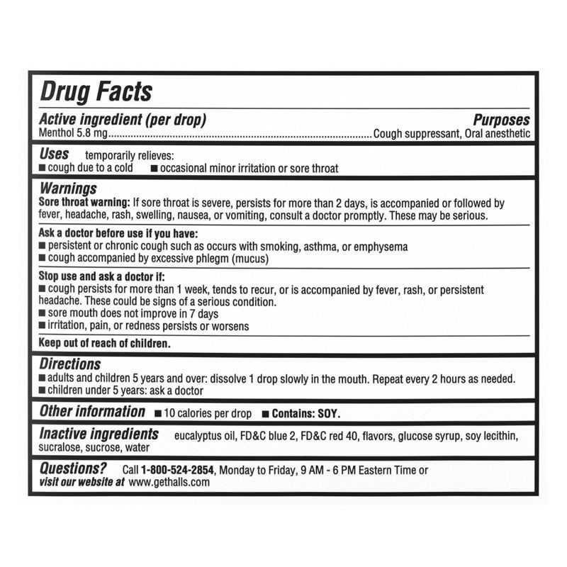 Active Ingredient (in each drop) - Purposes.\nMenthol 5.8mg - Cough Suppressant, Oral Anesthetic.\nInactive Ingredients: Eucalyptus Oil, FD&C Blue 2, FD&C Red 40, Flavors, Glucose Syrup, Soy Lecithin,…