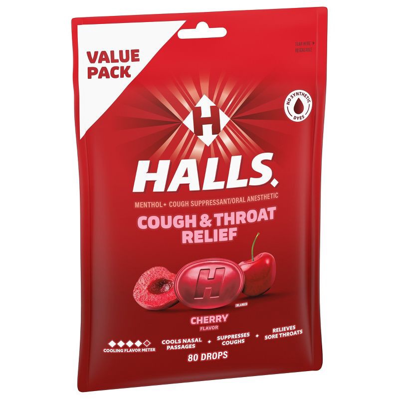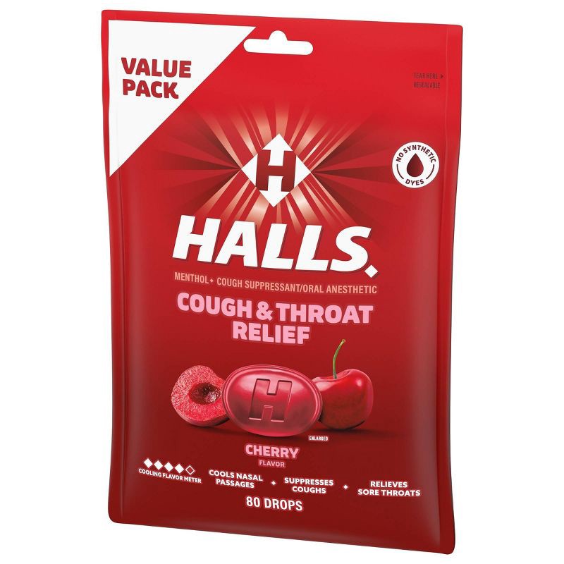 - One value pack bag of 80 HALLS Cough and Throat Relief Cherry Cough Drops (packaging may vary)