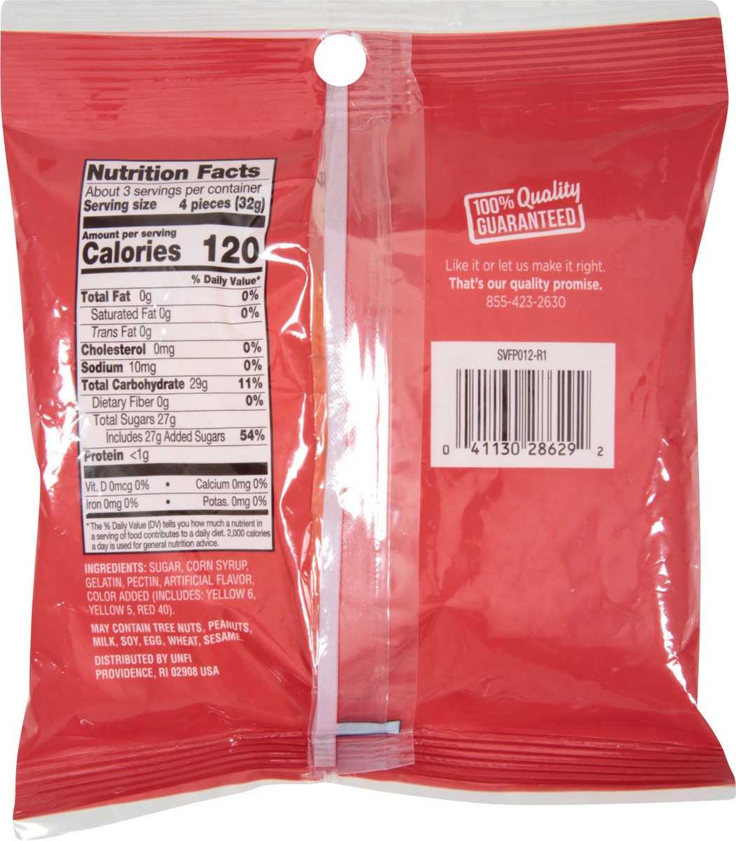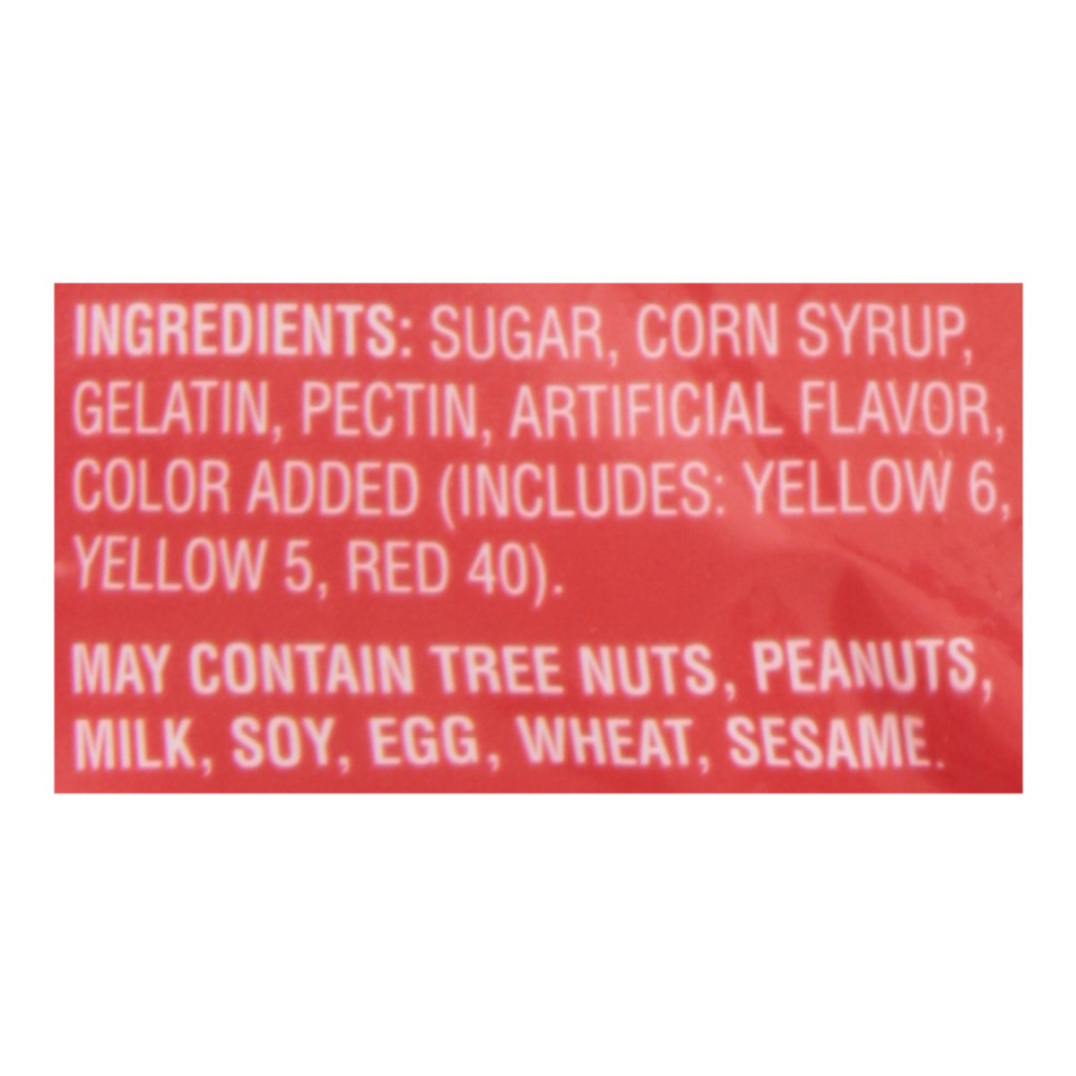 Sugar, Corn Syrup, Gelatin, Pectin, Artificial Flavor, Color Added (Includes: Yellow 6, Yellow 5, Red 40).